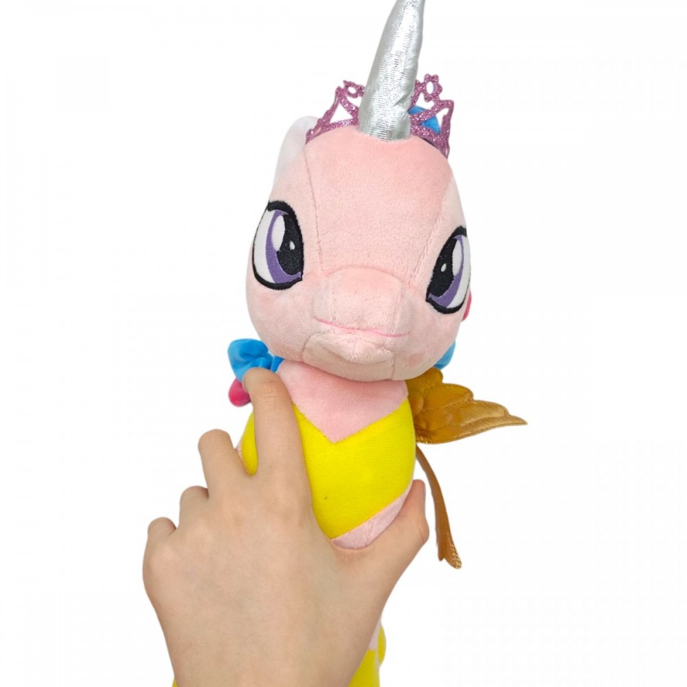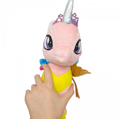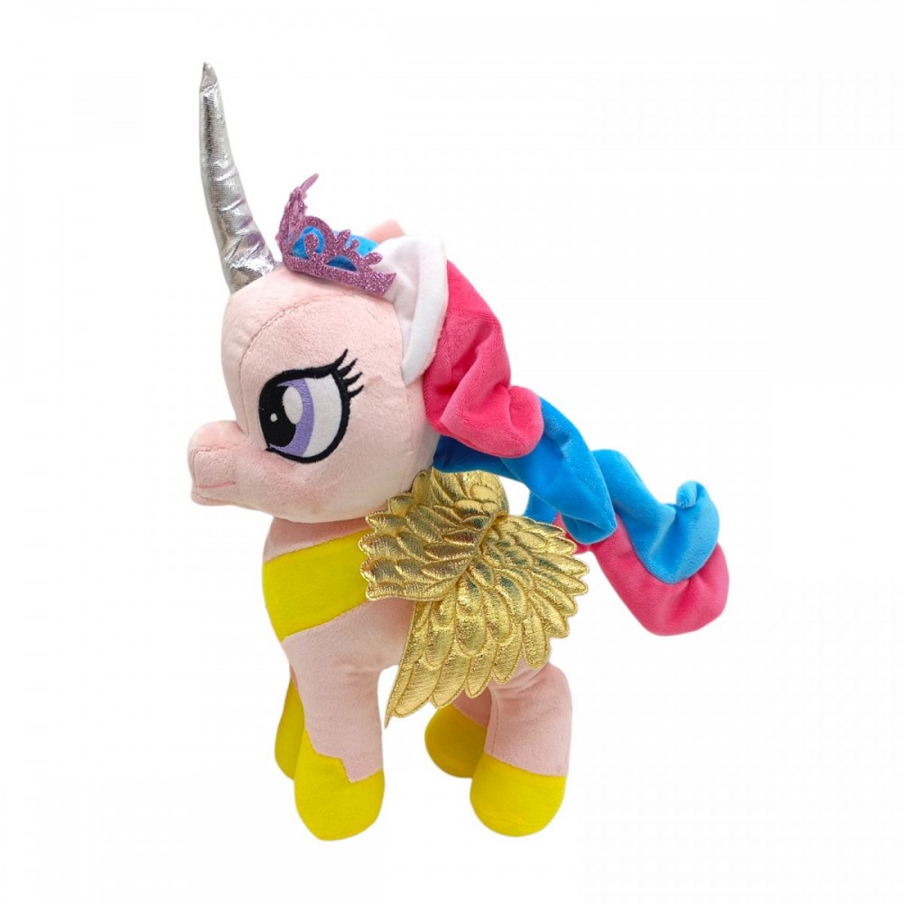 Чарівна мʼяка іграшка у вигляді поні-пегаса, виконана у стилістиці популярного мультсеріалу "My little pony" (Моя маленька поні). Крильця виконані з красивої блискучої тканини. Іграшка дуже мʼяка і приємна на дотик, якісна та міцна. Розмір – 25х26х10 см.
