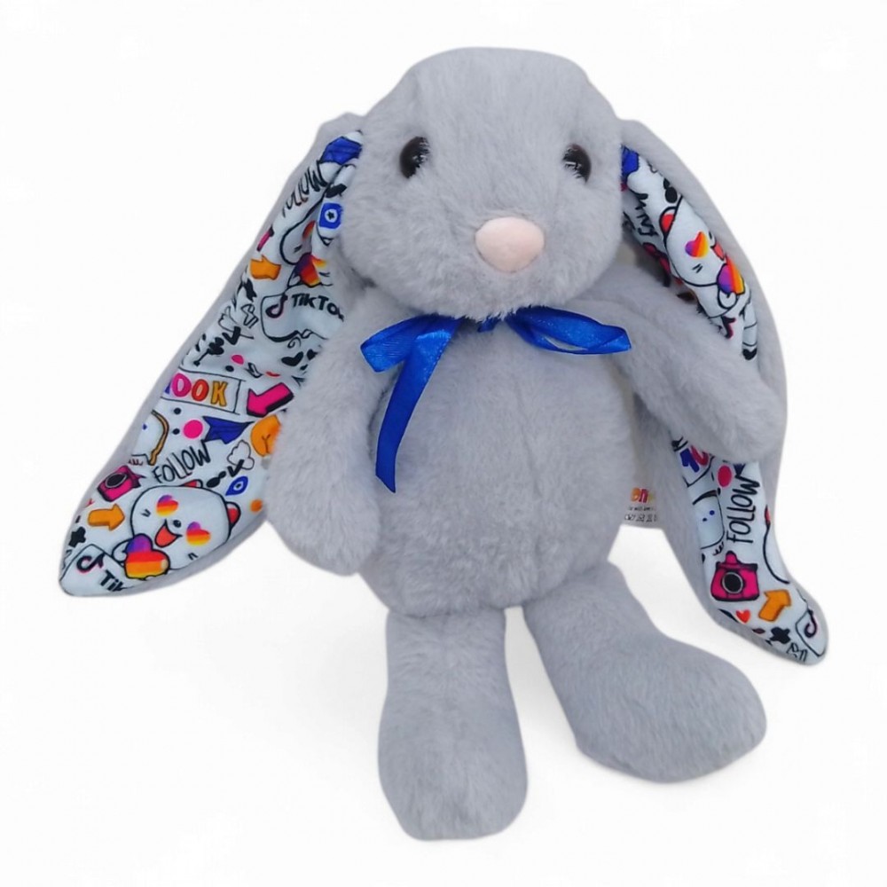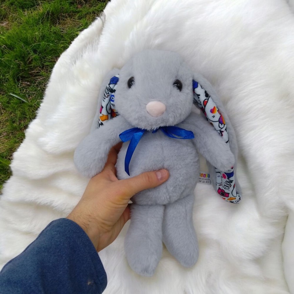 Чарівна мʼяка іграшка у вигляді зайчика з довгими вушками. Внутрішній бік вушок прикрашений тканиною з принтом, на якому зображені різноманітні солодощі. Іграшка виконана з якісних та міцних матеріалів, дуже мʼяка та приємна на дотик. Висота зайчика – 28 см.