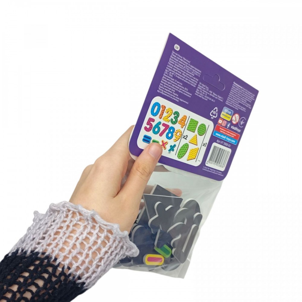 Магнітна гра "Цифри і геометричні фігури". Набір включає 32 яскравих, мʼяких магніту з цифрами, математичними знаками і геометричними фігурами.