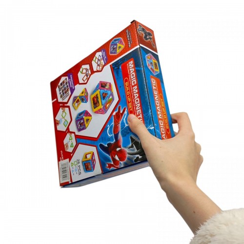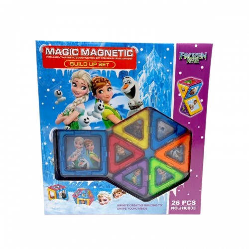 Магнітний конструктор "Magic Magnetic" на 26 деталей різних форм, які кріпляться між собою за допомогою магнітної основи. У комплекті: 6 квадратів і 6 вставок до них, 8 трикутників, і 8 вставок, наклейки із зображеннями персонажів м / ф "Щенячий патруль", інструкція з різними варіантами збірок. Розмір трикутника: 5,5 см, а квадрата - 6 см.