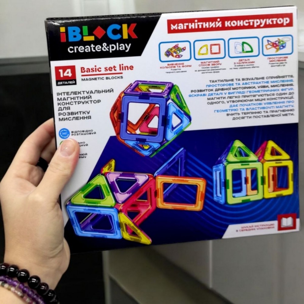 Магнітний конструктор "Кольорові магніти" складається з 8-ми деталей трикутної і 6-ти деталей квадратної форми, які кріпляться один до одного за допомогою магнітів, які знаходяться в пластиковому корпусі. За допомогою конструктора можна створювати різні цікаві фігури. Розвиває просторову і абстрактне мислення, дрібну моторику рук, проявляє уяву і фантазію. Розмір одного трикутника: 5,5 х 5,5 х 5,5 см. Розмір одного квадрата: 6 х 6 см.