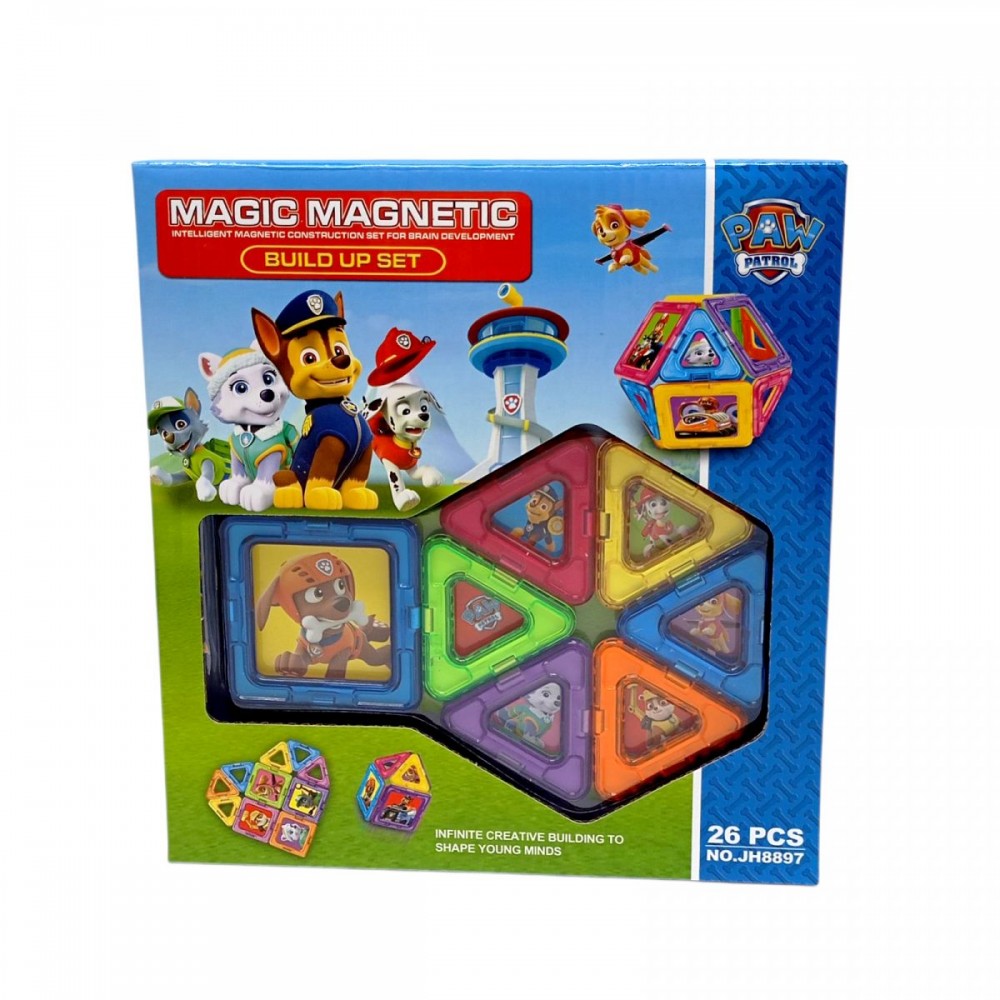 Магнітний конструктор "Magic Magnetic" на 26 деталей різних форм, які кріпляться між собою за допомогою магнітної основи. У комплекті: 6 квадратів і 6 вставок до них, 8 трикутників, і 8 вставок, наклейки із зображеннями персонажів м / ф "Щенячий патруль", інструкція з різними варіантами збірок. Розмір трикутника: 5,5 см, а квадрата - 6 см.