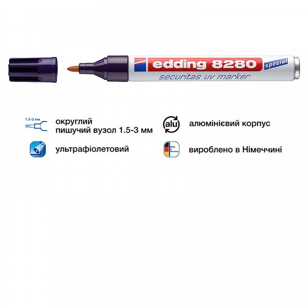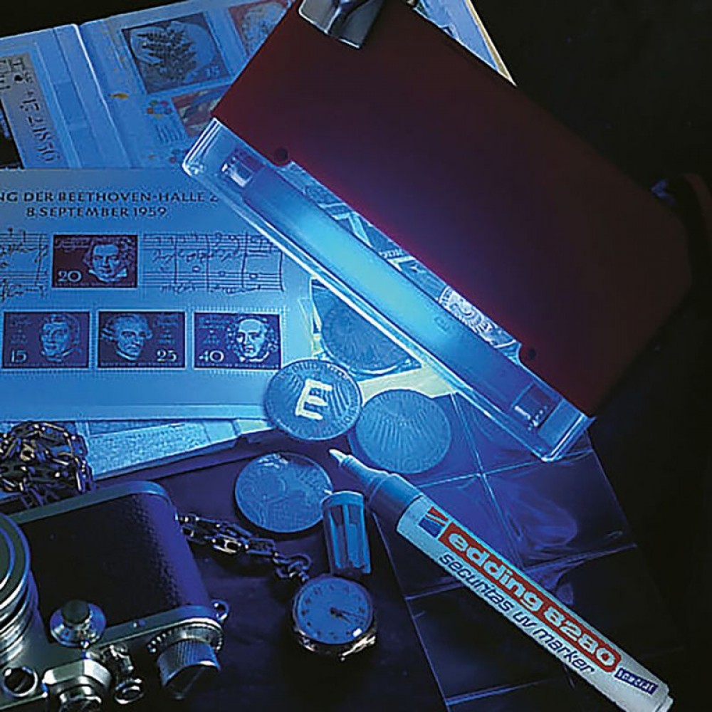 Перманентний маркер для прихованого маркування речей. Слід чорнила видно тільки при ультрафіолетовому освітленні. Може використовуватися для маркування техніки, деталей автомобілів, комп'ютерів та ін. Круглий пишучий вузол. Алюмінієвий корпус. Ширина сліду 1,5-3 мм. Колір чорнила: безбарвний.