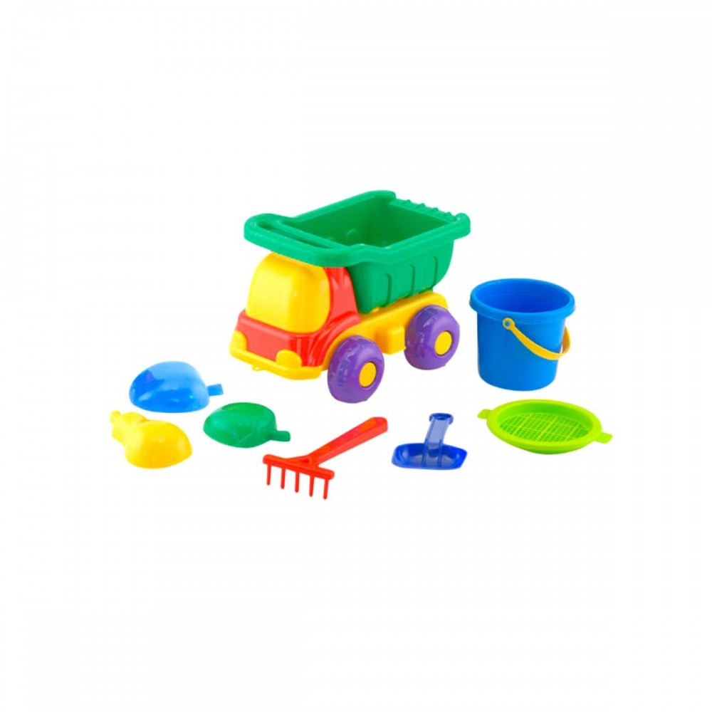 Машинка "Бджілка №3" з пісочним набором. У комплект входить: машинка самоскид з відкидним кузовом, відро з ситом, лопатка, граблі та 3 пасочки. З цим набором дитина зможе грати як вдома, так і на вулиці.