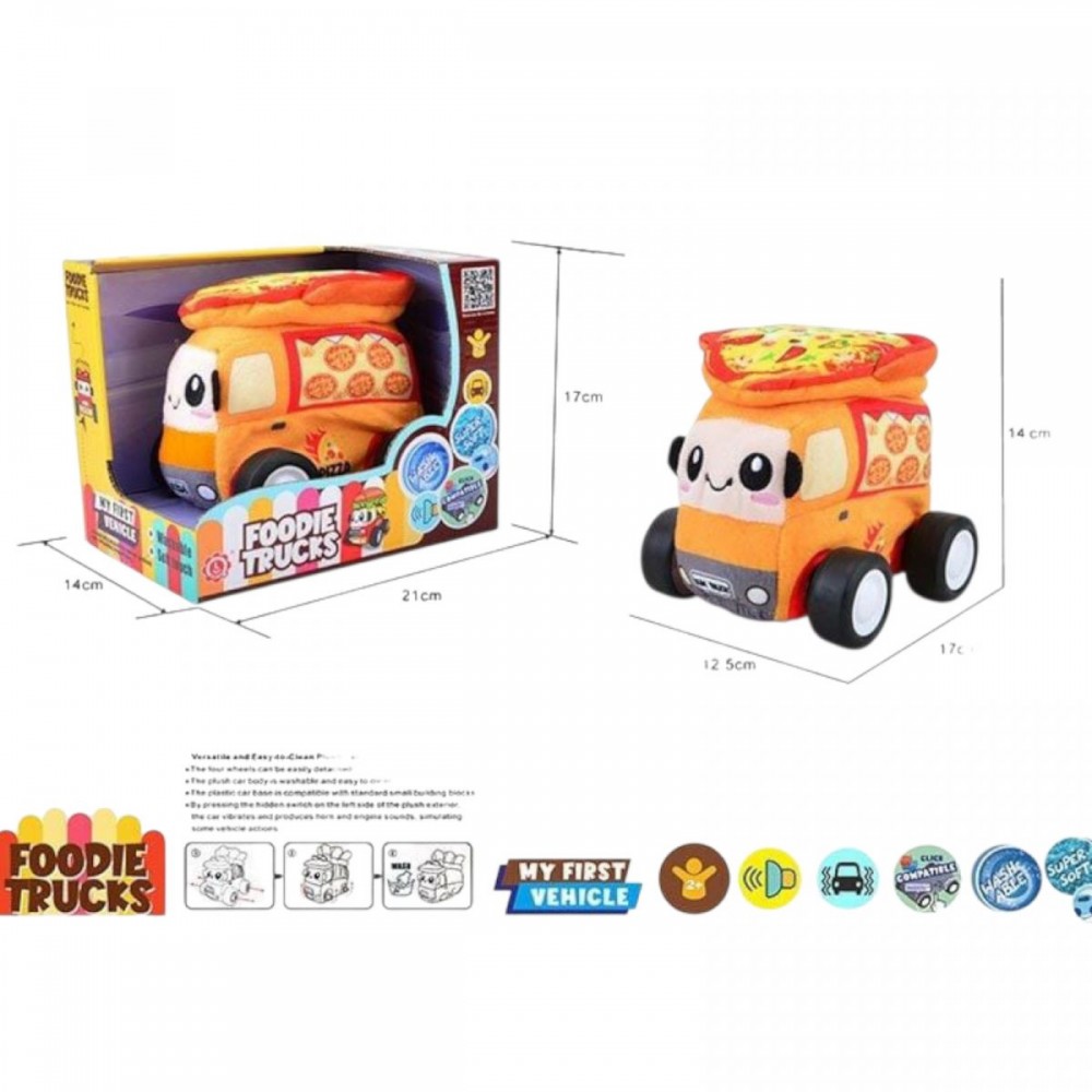 Інтернет-магазин eToys пропонує вашій увазі товар "Машинка м`яка “Піца”, звуки транспорту, веселі мелодії, вібрація, знімний чохол, гумові шини, на батарейках, в коробці" за ціною 546 грн..