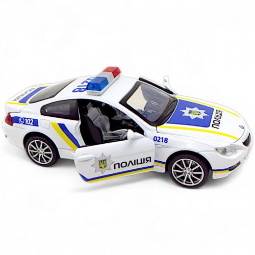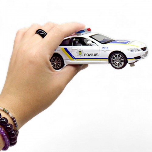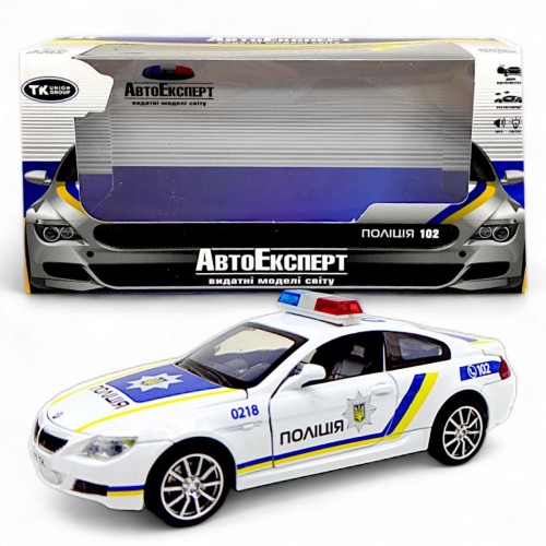 Машинка металева "Поліція" із серії "Авто Експерт". Модель дуже якісна та деталізована. Інерційний механізм, прогумовані колеса. Відчиняються передні двері, багажник та капот. Світло фар та реалістичні звукові ефекти. Укомплектована машинка в презентабельну картонну коробочку зі слюдою. Масштаб – 1:32.