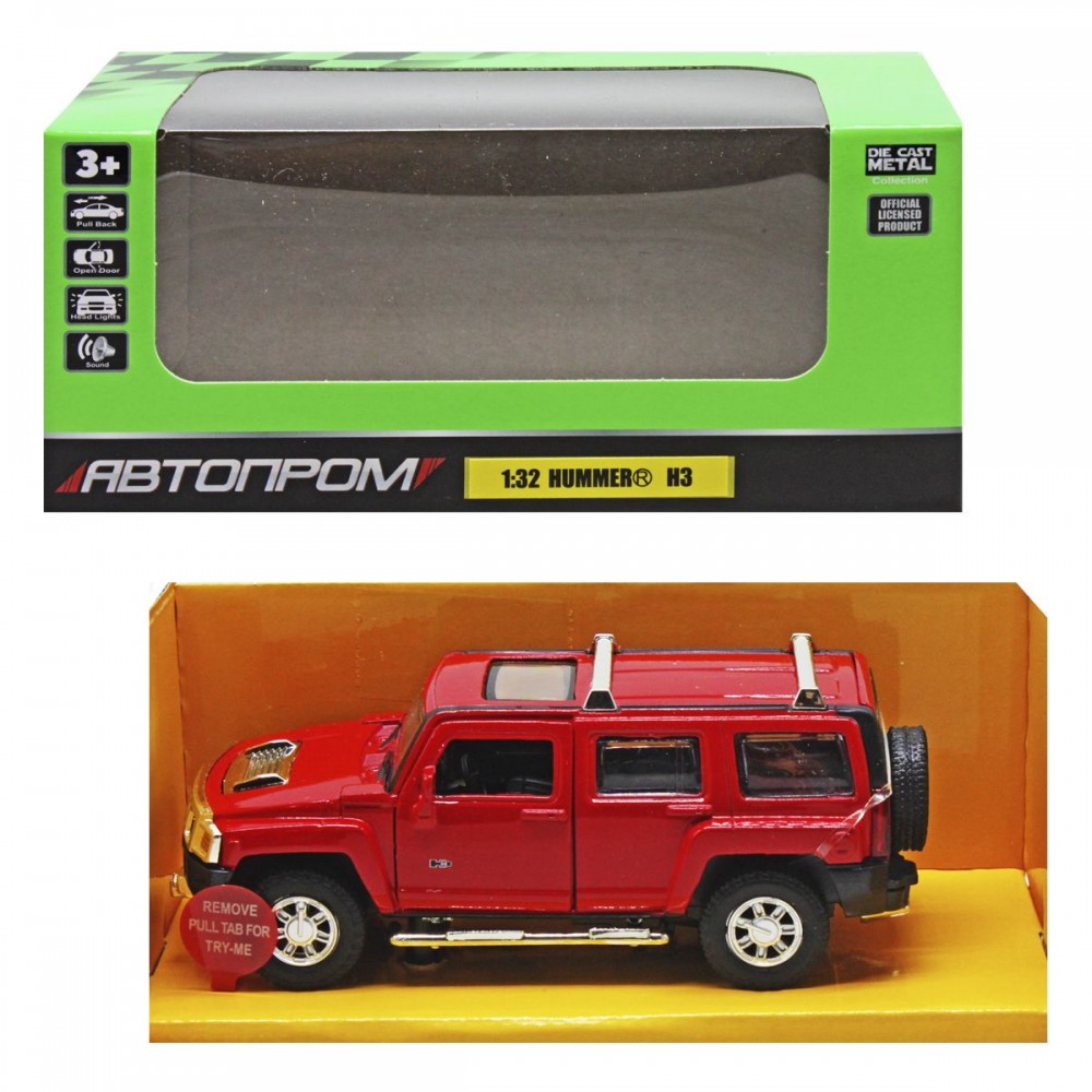Реалістична металева модель Hummer H3. Інерційна, відкриваються передні двері та багажник. Дуже даталізована зовні та всередині. Оснащена звуковими (аварійка, звуковий сигнал, звуки двигуна) та світловими ефектами (світло фар, салону). Масштаб – 1:32. Працює від 3-х батарейок AG13 (є в комлекет).