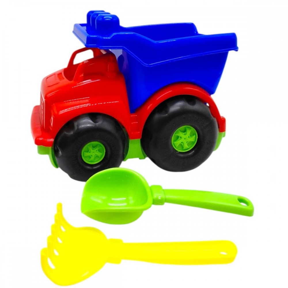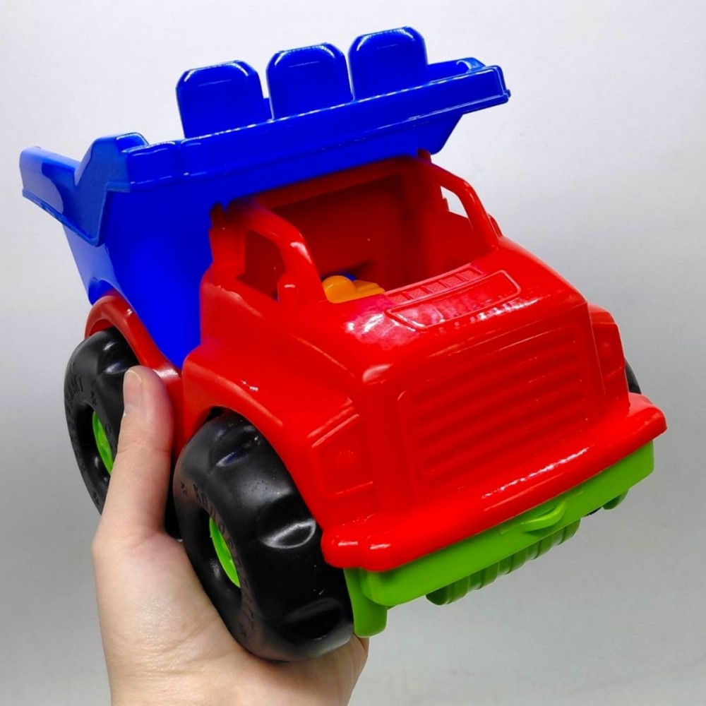 Машина "Тотошко" самоскид №1. Яскравий пластиковий вантажівка з великими колесами і відкидним кузовом. Усередині машинки - простора кабіна з місцем для водія. Також в наборі є: лопатка, грабельки (по 14 см).