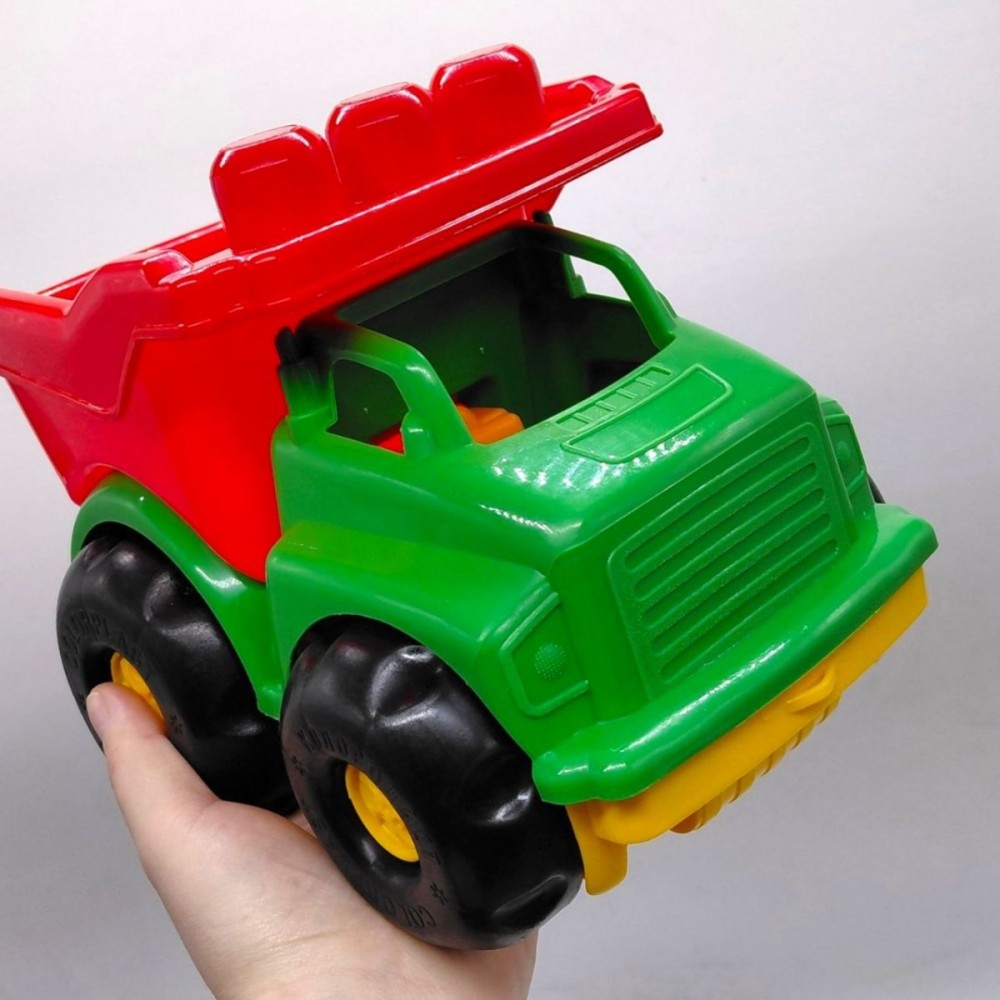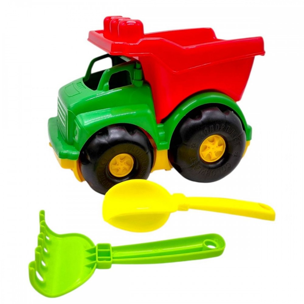 Машина "Тотошко" самоскид №1. Яскравий пластиковий вантажівка з великими колесами і відкидним кузовом. Усередині машинки - простора кабіна з місцем для водія. Також в наборі є: лопатка, грабельки (по 14 см).