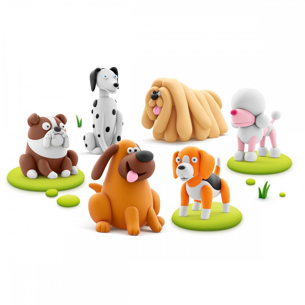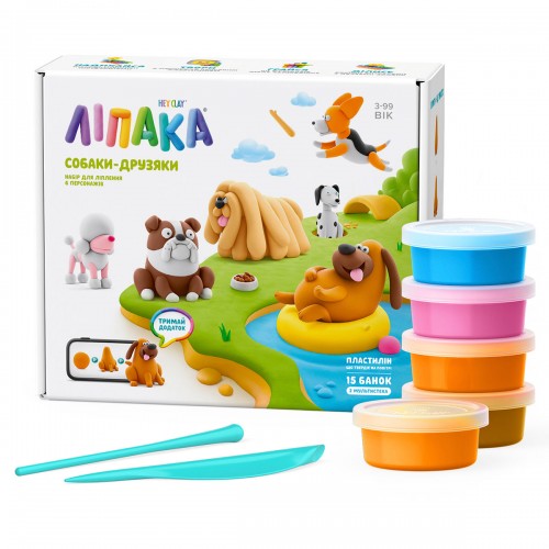 Меганабір пластиліну, що самостійно твердіє, ЛІПАКА – СОБАКИ-ДРУЗЯКИ – розважить і малюків і дорослих. За допомогою анімаційних інструкцій в додатку HEY CLAY, Ви зможете зліпити 6 унікальних персонажів: Бігль Вокі, Бульдог Гіпно, Лабрадор Ням-Ням, Пудель Поппі, Комондор Муді та Далматинець Турбо. Пластилін твердіє на повітрі протягом 24 годин, після чого можна гратися створеними фігурками.