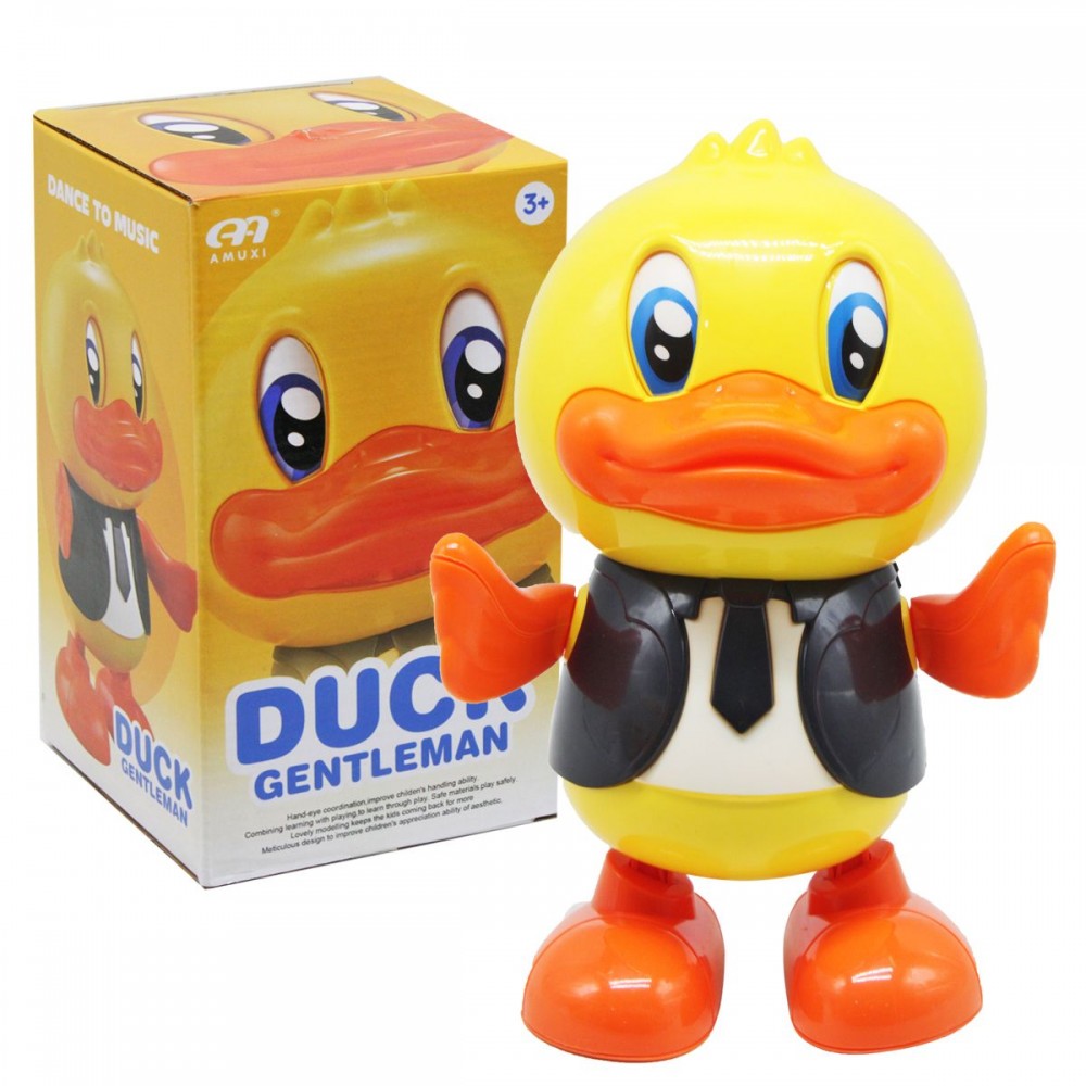 Яскрава музична іграшка у вигляді каченя, що виконує динамічний танець у такт веселої музики. Іграшка виконана в яскравому, цікавому дизайні. При включенні, лапки починають світитися різними кольорами, а очі рухаються у різні сторони. Розмір іграшки: 20х13х8 см. Виконаний з якісних та міцних матеріалів. Працює від 3-х батарейок АА.