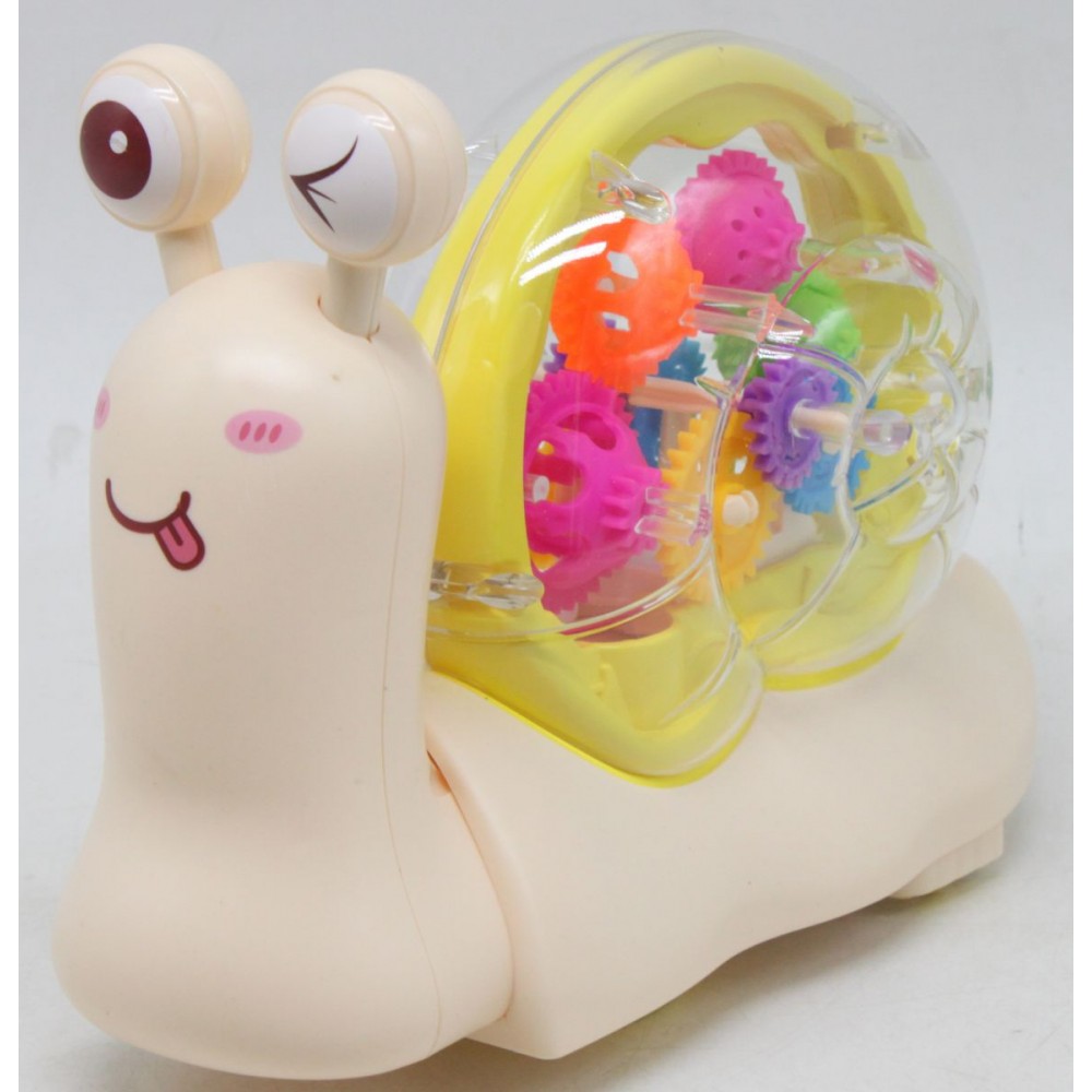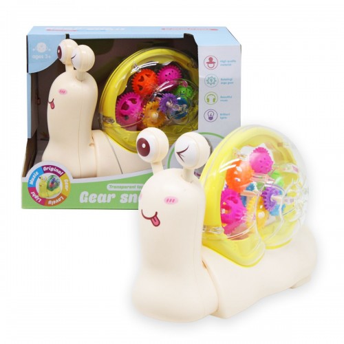 Оригінальна музична іграшка у вигляді равлика з прозорою черепашкою. Усередині мушлі видно механізми - різнокольорові шестерні, які обертаються при включенні. Равлик їздить у довільних напрямках, грає веселу мелодію під час їзди. Має яскраве різнокольорове підсвічування. Розмір іграшки: 14х19х7 см.