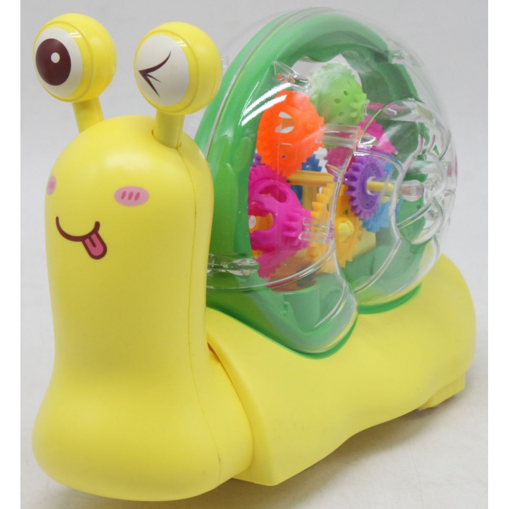 Оригінальна музична іграшка у вигляді равлика з прозорою черепашкою. Усередині мушлі видно механізми - різнокольорові шестерні, які обертаються при включенні. Равлик їздить у довільних напрямках, грає веселу мелодію під час їзди. Має яскраве різнокольорове підсвічування. Розмір іграшки: 14х19х7 см.
