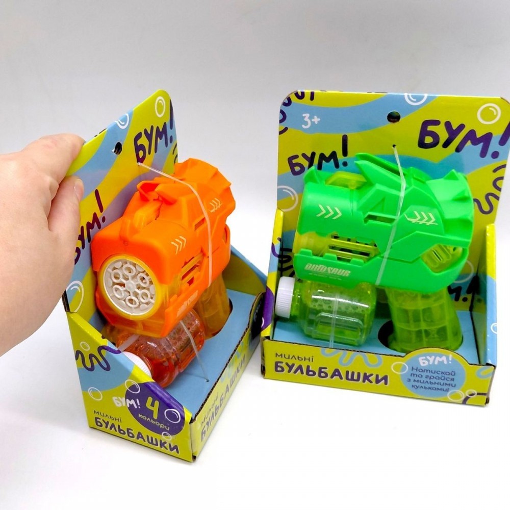 Пістолет для мильних бульбашок у формі динозавра — яскрава іграшка для активних ігор на вулиці та вдома. Оснащений механізмом для швидкого створення великої кількості бульбашок. Підходить для дітей від 3 років, допомагає розвивати уяву, координацію рухів та дарує позитивні емоції.