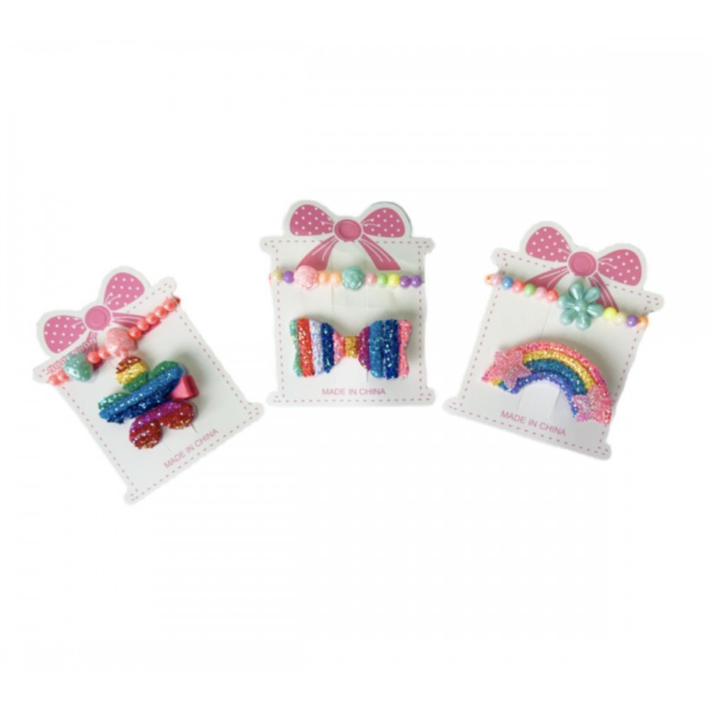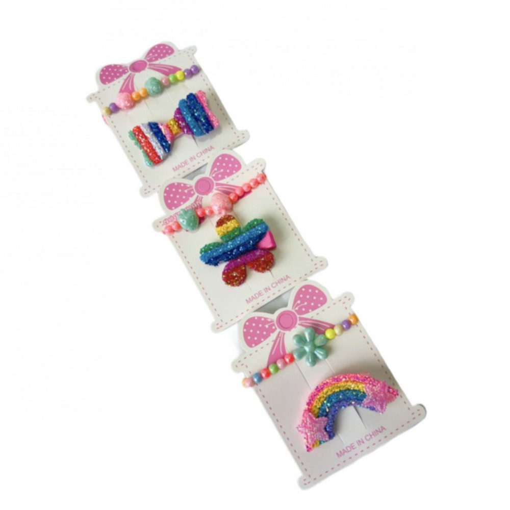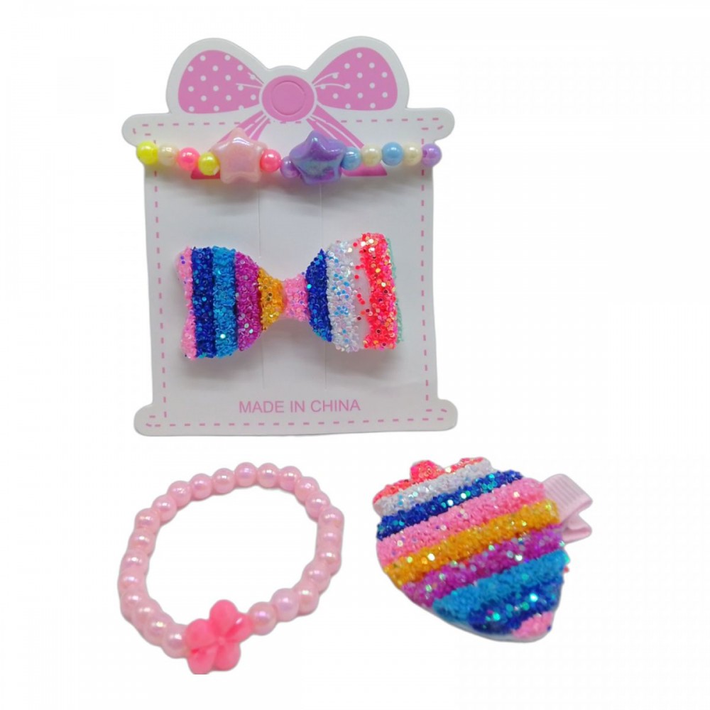 Невеликий набір милих аксесуарів для дітей. У комплекті є шпилька у вигляді веселки та чарівний рожевий браслетик на резинці. Виконано з якісних та міцних матеріалів. Аксесуари допоможуть дитині виділитися та стануть чудовим доповненням образу на свята або просто у повсякденному житті. Різні види в асортименті.