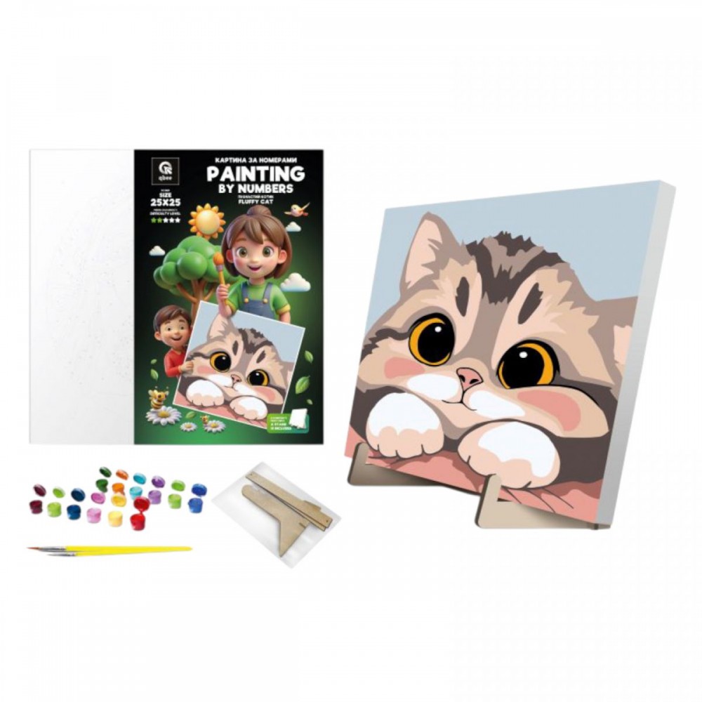 Інтернет-магазин eToys пропонує вашій увазі товар "Набір для розпису по номерах 25х25 см "Пухнастий котик" з деревʼяною підставкою" за ціною 307 грн..