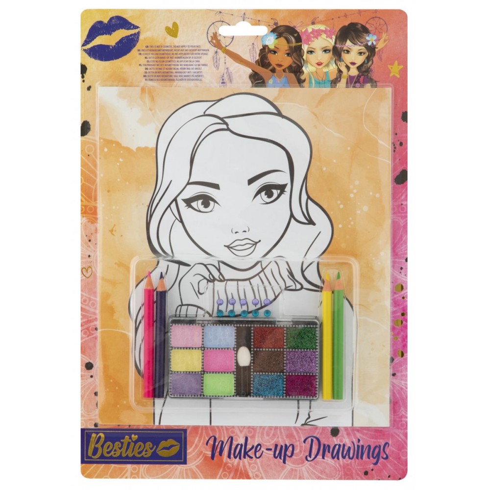 У світі кольору й вишуканості розцвітає творчість. Besties Набір Стильний макіяж — магія на пензлику! Чотири аркуші для фарбування, палітра з чарівними тінями, чотири олівці для контуру і десять стразів, щоб додати блиск до твоїх творінь. І кожен образ — твоя нова майстерня краси.