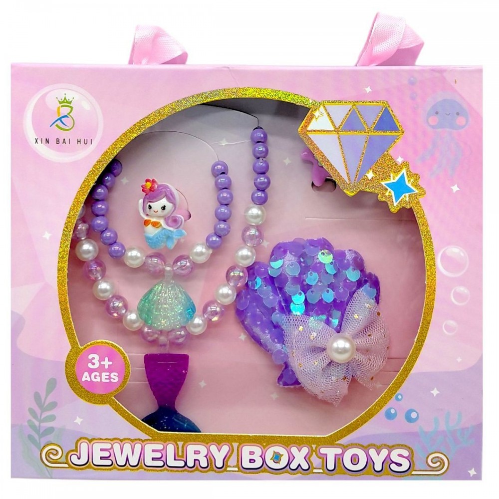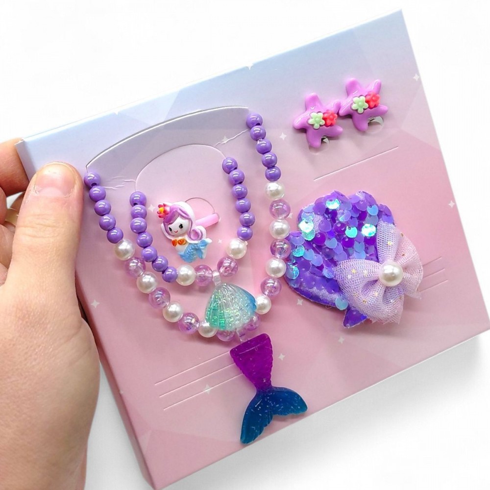 Комплект прикрас виконаний у ніжній фіолетовій гамі з морськими декоративними елементами. До набору входять намисто з підвісками, сережки та додаткові аксесуари для створення завершеного образу. Прикраси легкі, комфортні у носінні та адаптовані для дітей.
