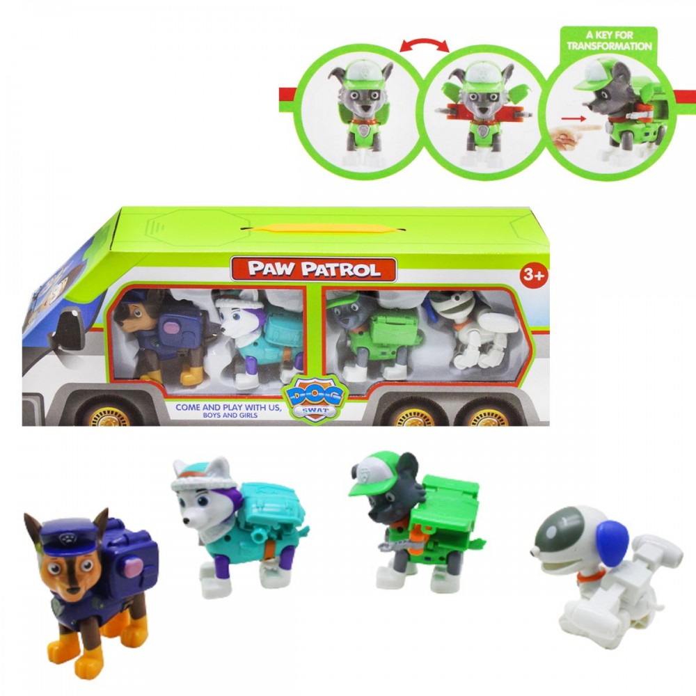 Набір фігурок-персонажів мультфільму "Щенячий патруль" (Гончік, Еверест, Роккі, Робопёс). Рюкзачок кожної собачки трасформіруется в інструмент. Висота фігурки: ~ 9 см. Всі елементи набору виготовлені з міцного, якісного пластику.