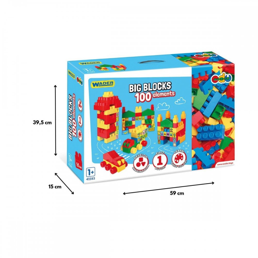 Big Blocks – набір конструктору в коробці класичних кольорів і сучасного дизайну, який зацікавить кожного малюка. До набору входять наклейки - цифри,букви, фігури, фрукти, овочі, тварини , діти та інші, що зроблять гру ще цікавішою. Легка система кріплення, а також відповідний розмір, робить цю іграшку ідеальною для ручок найменших діток. Створюючи спочатку прості, а згодом і щораз складніші споруди, дитина розвиває креативність, уяву і пам'ять. Граючись конструктором Big Blocks, дитина тренує підготовленість ручок, точність хватки, зорово-рухову координацію і концентрацію уваги, вивчає між іншим лічбу, кольори і форми, розвиває просторову уяву (над, під, право, ліво, збоку), формує поняття малий - великий. Спільна гра конструктором з батьками чи іншими дітьми розвиває також комунікативні вміння. Всі елементи виготовлені з високоякісного безпечного і міцного матеріалу, завдяки чому всі частини траси зберігатимуть вигляд і колір протягом багатьох років. Набір упакований в гарну коробку, ідеальну на подарунок. Big Blocks: набір із 100 елементів класичних кольорів містить наклейки - цифри,букви, фігури, фрукти, овочі, солодощі , діти , тварини та інші має легку систему кріплення ідеально підходить для найменших дітей виготовлений з високоякісного безпечного і міцного матеріалу упакований в гарну коробку, ідеальну на подарунок для дітей від 1 року