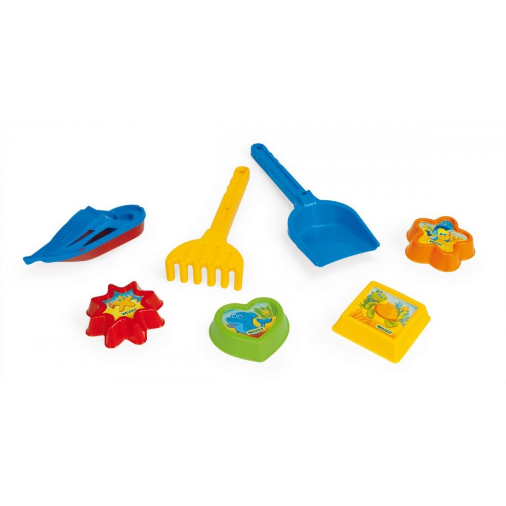 Набір літній 7 елементів від польського виробника Wader створений дарувати малюкам чудовий настрій та цікаві ігри в пісочниці або на пляжі. Веселі картинки нанесені на елементи набору за допомогою сучасної технології IML (In-Mould Labelling), що робить їх дуже стійкими до стирання. Кораблик особливо добре підійде для ігор з водою. Яскраві і зручні грабельки, лопатка і формочки дозволять малюкові ліпити з піску різні фігурки. Граючи з набором, малюк розвиває свої маленькі ручки і відкриває в собі творчі здібності. Набір для піску Wader виготовлений з якісних, міцних, абсолютно безпечних матеріалів. Завдяки стійкості до погоди його можна цілий рік зберігати у дворі або на балконі. Упаковка - сітка.