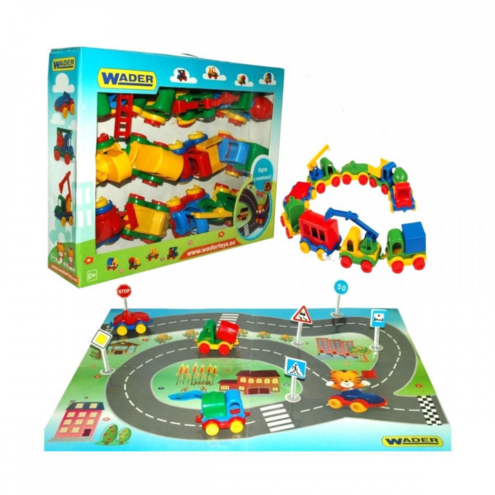 Набір складається з 12-ти яскравих пластикових машинок: вантажівок, екскаваторів, легковий і гоночної машини, бетономішалки та поїзди з причепом. Також в наборі є велика карта (79 х 59 см) з намальованою на ній дорогий. Сама коробка містить 6 дорожніх знаків і світлофор, які потрібно видавити з картону і встановити на дорозі за допомогою підставки-основи. Розмір однієї машинки: 9 см.