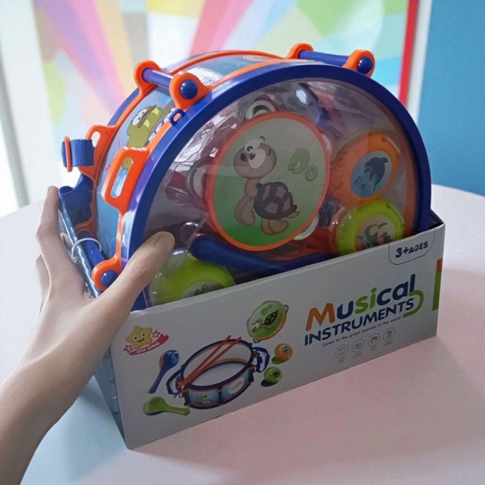 Інтернет-магазин eToys пропонує вашій увазі товар "Набір музичних інструментів барабан: 28х28х12 см, барабанні палички, маракаси, бубон, кастаньєти, ремінець, в коробці" за ціною 540 грн..