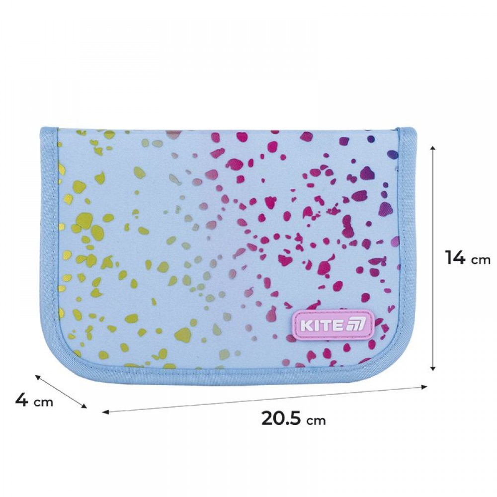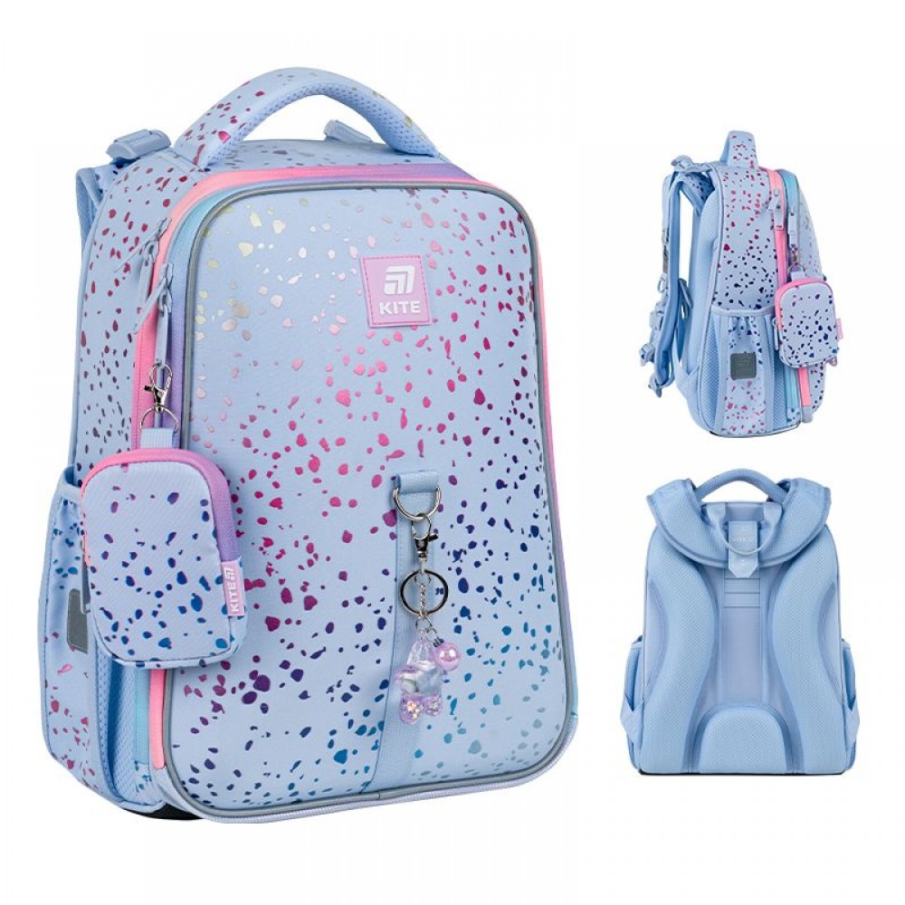 Рюкзак зовні: запатентована ортопедична спинка Ergo Kids; система регулювання спинки під зріст дитини; широкі S-подібні лямки; 2 відділення; 2 бічні кишені; світловідбивні елементи; м'яка ущільнена ручка та текстильна петля; знімний нагрудний ремінь; ущільнене дно з захисним покриттям та ніжками; зносостійкі блискавки, надійна фурнітура; знімний гаманець на карабіні. Рюкзак всередині: роздільники; кишені для планшета та телефона з плюшевою підкладкою; внутрішня кишеня на резинці; органайзер; знімна ключниця; брендована підкладка; поле для персональних даних; навігаційні значки. Декор: металізований друк, брелок-підвіска у формі зірочки с блискітками Сумка для взуття: 1 відділення, петля для вішалки, світловідбивні елементи, декор: металізований друк Пенал: 1 відділення, 1 відворот, резинки для фіксації канцелярії, розклад, без наповнення, декор: металізований друк