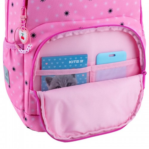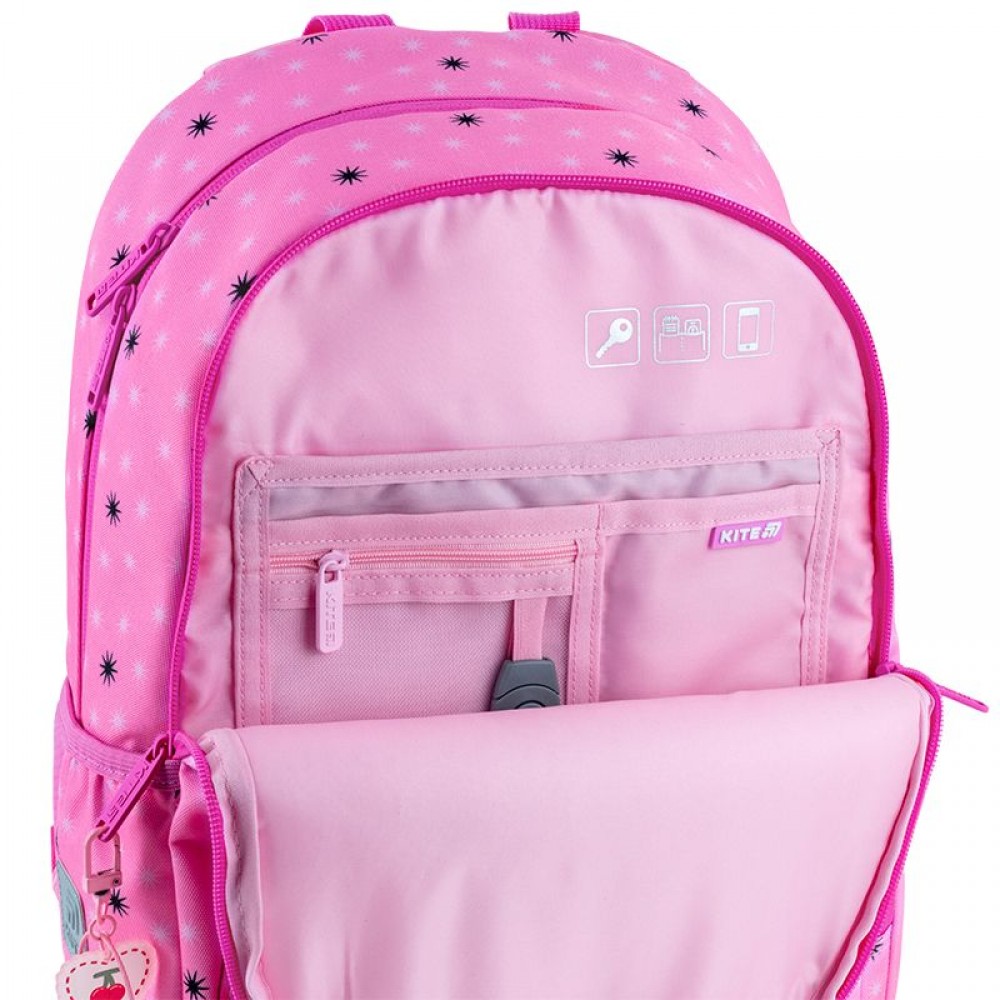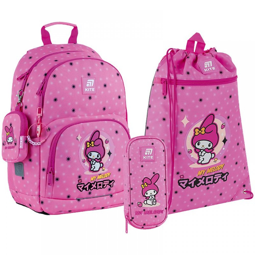 Рюкзак зовні: запатентована ортопедична спинка Ergo Kids; широкі S-подібні лямки; 2 відділення; 1 об'ємна передня кишеня; 2 бічні кишені; світловідбивні елементи; ручка з гумовою вставкою; знімний нагрудний ремінь; ущільнене дно з захисним покриттям; зносостійкі блискавки, надійна фурнітура; знімний гаманець на карабіні. Рюкзак всередині: роздільники з фіксуючою резинкою; кишені для планшета та телефона з плюшевою підкладкою; 1 внутрішня кишеня; органайзер; знімна ключниця; брендована підкладка; поле для персональних даних; навігаційні значки. Декор: об'ємний друк, гумовий бейдж, об'ємна вишивка, брелок-підвіска з комбінованих матеріалів Сумка для взуття: 1 відділення, 1 передня кишеня, петля для вішалки, світловідбивні елементи, декор: об'ємний друк Пенал: 1 відділення, резинки для фіксації канцелярії, декор: об'ємний друк