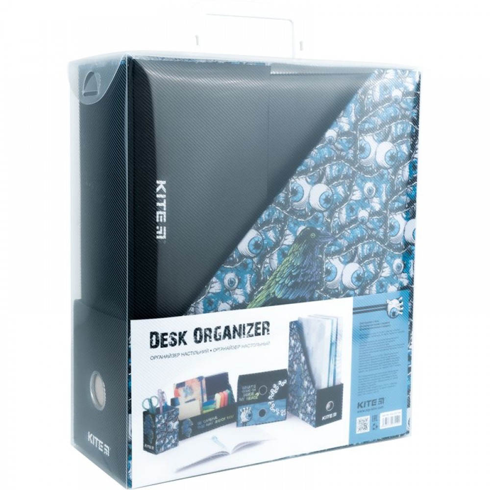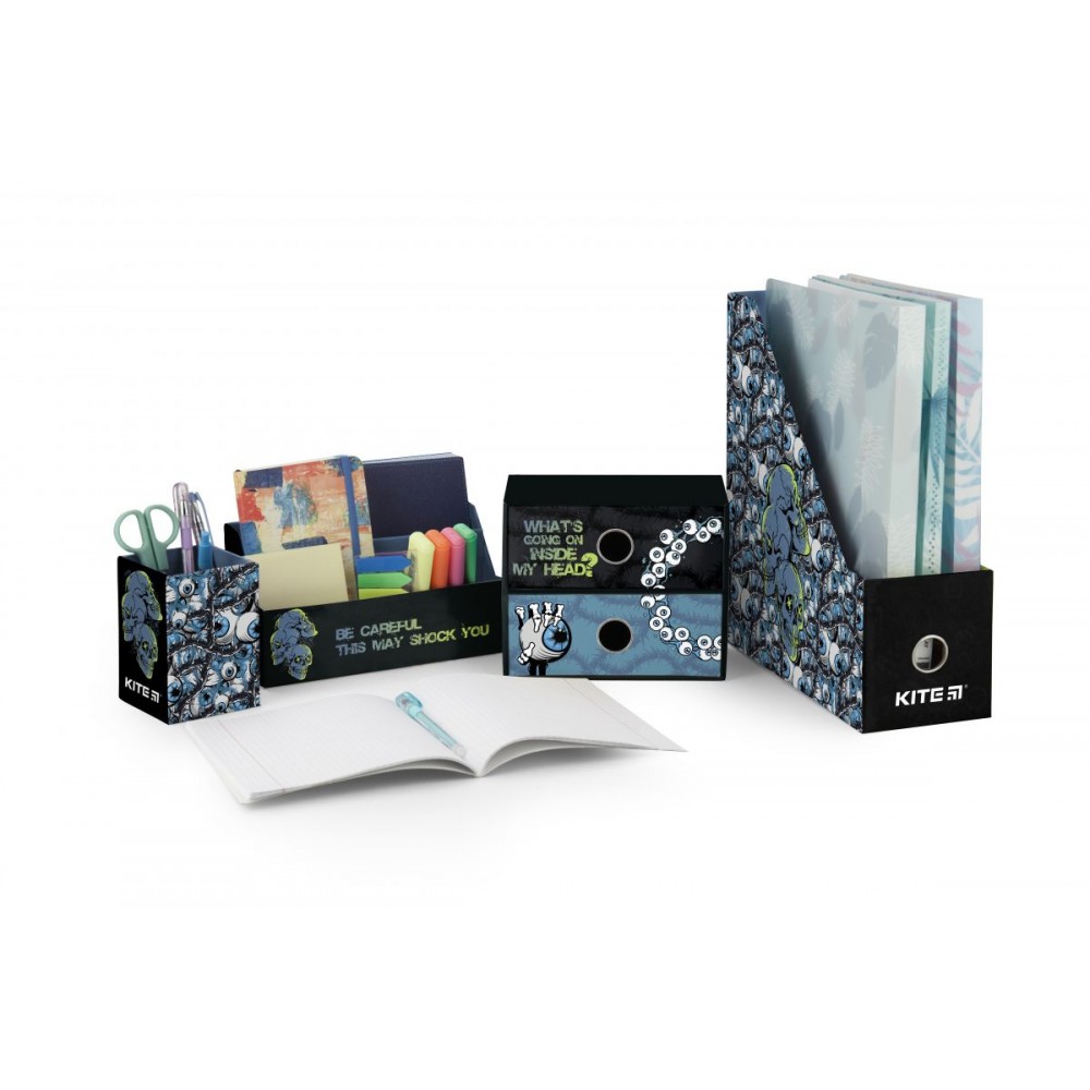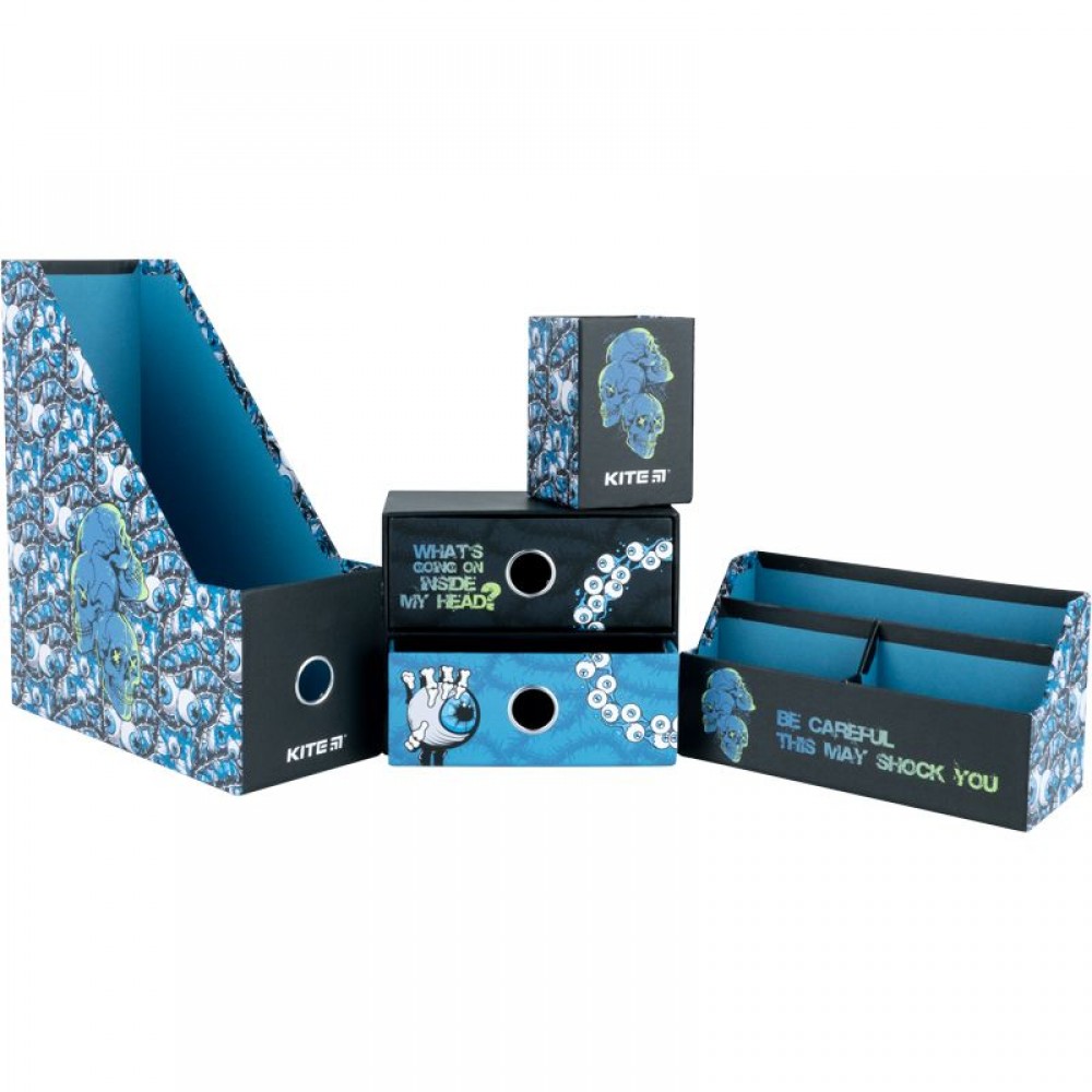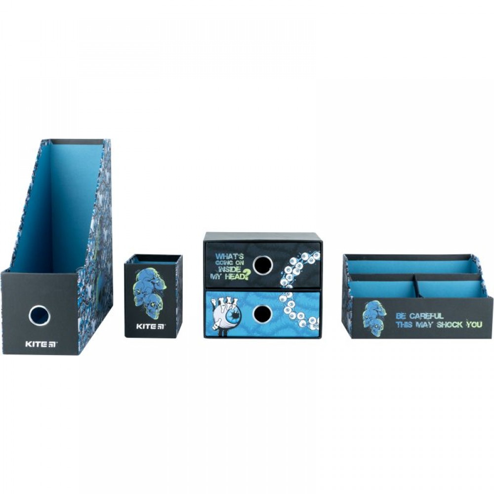 Органайзер настільний Kite K22-357-01 (4 предмети) призначений для зберігання канцелярії та дрібниць. Особливості: • лоток для канцелярського приладдя - 10,8*25.5*30 см; • підставка для дрібниць - 21.4*9.5*11.4 см; • стакан для ручок - 8*8*11.5 см; • міні-комод з двома висувними шухлядами для дрібниць - 18*9.8*15 см; • матеріал – ущільнений картон; • яскравий трендовий дизайн; • упаковка: пластиковий бокс з ручкою.
