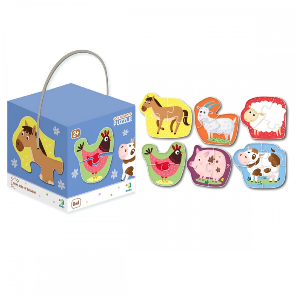 Набір включає 6 пазлів із зображенням домашніх тварин, які складаються з 2,3 або 4 елементів. Великі деталі пазла, приблизний розмір елемента - 11 х 7 см.