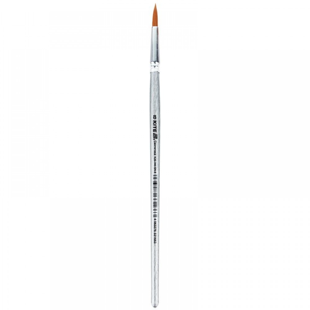 Пензель №8 Kite K25-340-SN-8 допоможе дитині з легкістю втілити свою творчу задумку на папері. Пензель призначений для малювання водорозчинною фарбою - аквареллю, гуашшю або темперою. Виріб має безшовну ручку, виготовлену з березової деревини, та обрамлену алюмінієвою обоймою. Щетина синтетична, тримає первісну форму і добре вбирає фарбу.