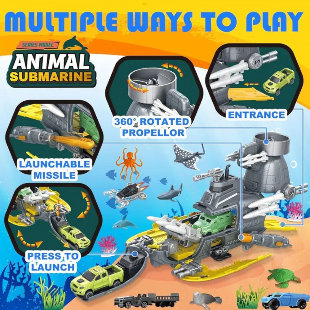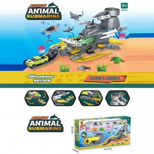 Інтернет-магазин eToys пропонує вашій увазі товар "Підводний човен “Субмарина”, 6 фігурок тварин, розкладається, механічний запускач, 2 пушки, снаряди, рухомі елементи, в коробці" за ціною 818 грн..