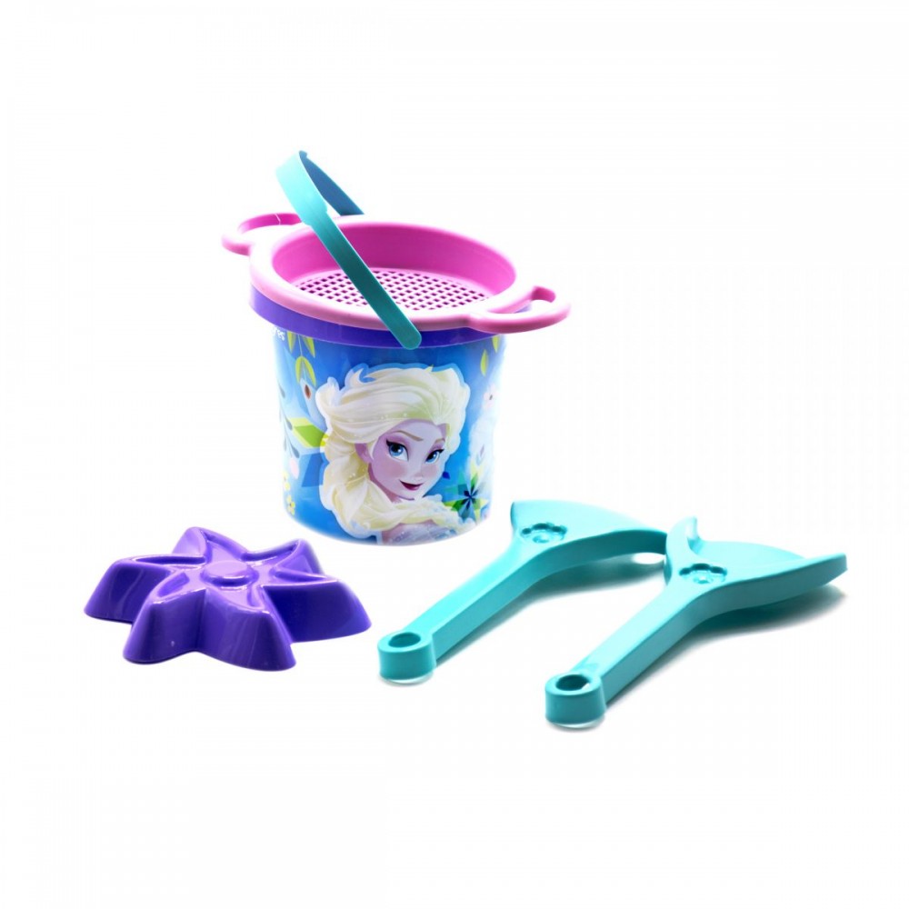 Пісочний набір з 5-ти предметів. У комплекті: яскраве пластикове відерце з термонаклейка із зображенням персонажів м / ф "Холодне серце", ситечко, лопатка, грабельки і пасочка. Розмір відерця: 12 х 14 см.