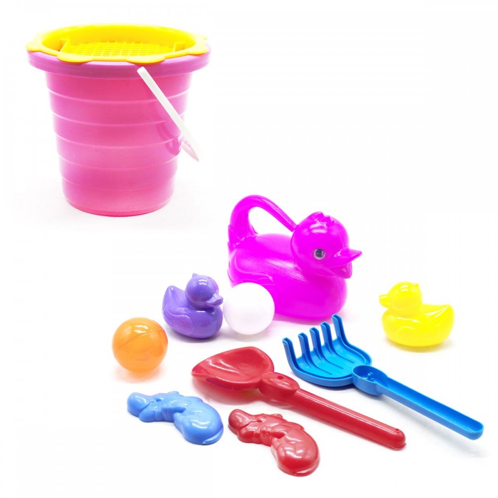 Яскравий пісочний набір. У комплекті: пластикове відерце, леечка, ситечко, лопатка, грабельки, 2 пасочки, 2 пластикових м'ячика, 2 качечки. Набір ідеально підійде для ігор в пісочку.