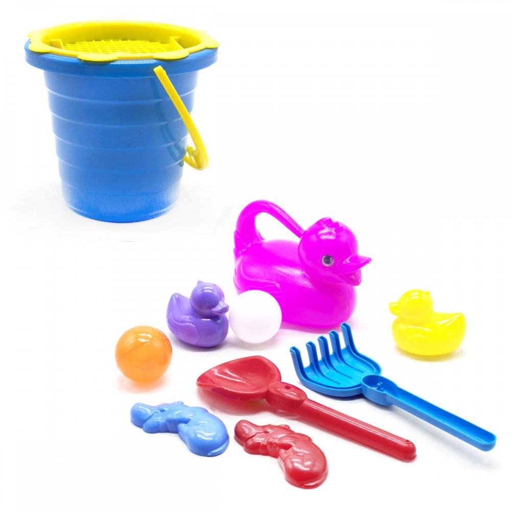 Яскравий пісочний набір. У комплекті: пластикове відерце, леечка, ситечко, лопатка, грабельки, 2 пасочки, 2 пластикових м'ячика, 2 качечки. Набір ідеально підійде для ігор в пісочку.