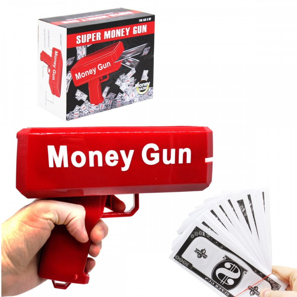 Незвичайний, цікавий пістолет, який стріляє не кульками або присосками, а справжніми грошима. З ним можна влаштувати ефектний феєрверк з паперових купюр. Купюри необовʼязково повинні бути справжніми - підійде і "валюта" з так званого Банку приколів (є в комплекті).