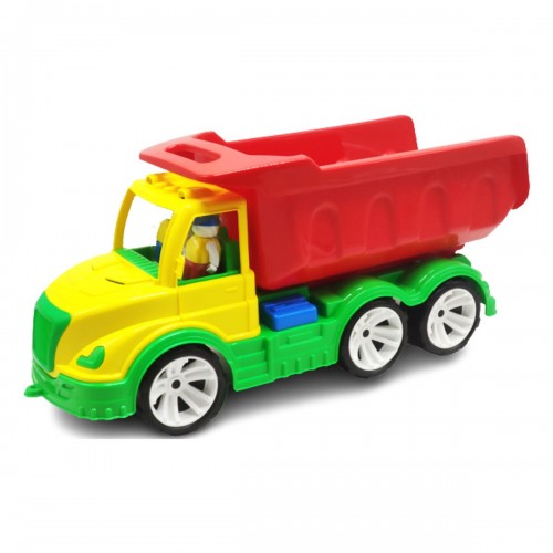 Яскравий, пластиковий самоскид із рухомим кузовом. У наборі є дві фігурки – водій та його напарник. Розмір іграшки: 50х24 см.