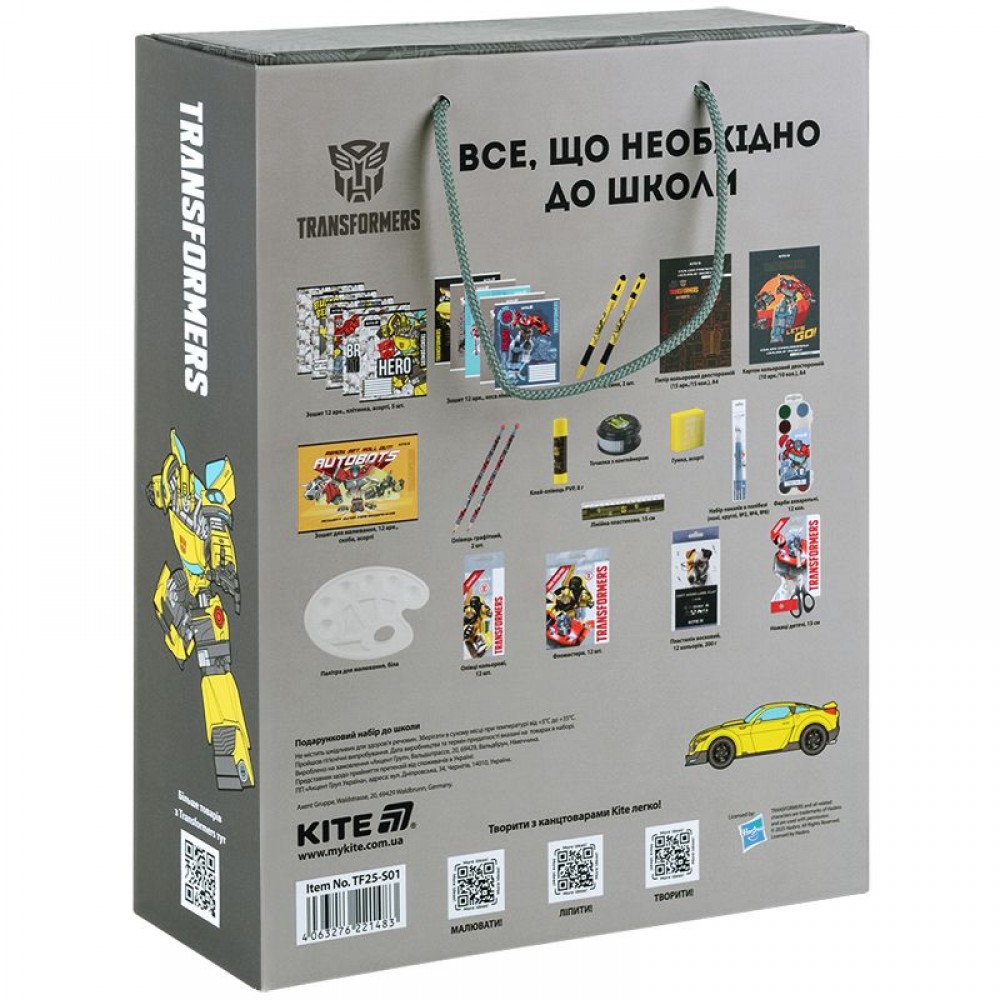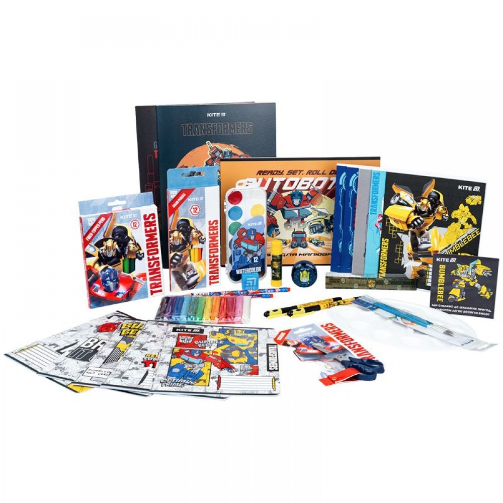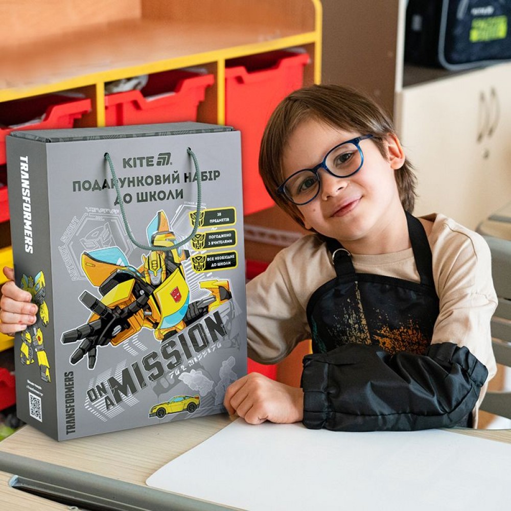 Подарунковий набір до школи Transformers - знахідка для юних школярів та їхніх батьків: - наповнення вивірено згідно з потребами маленьких школярів і містить базовий комплект канцелярського приладдя для початкових класів; - економить час - набором купувати; - стане відмінним подарунком для школяра! Склад: • Зошит 12 арк., клітинка, асорті — 5 • Зошит 12 арк., коса лінія, асорті — 5 • Зошит для малювання, 12 арк., скоба, асорті — 1 • Папір кольоровий двосторонній (15 арк./15 кол.), А4 — 1 • Картон кольоровий двосторонній (10 арк./10 кол.), А4 — 1 • Ручка масляна, синя — 2 • Олівці кольорові, 12 шт. — 1 • Олівець графітний - 2 • Точилка з контейнером - 1 • Гумка, асорті — 1 • Лінійка пластикова, 15 см — 1 • Фломастери, 12 шт. — 1 • Фарби акварельні, 12 кол. — 1 • Палітра для малювання, біла — 1 • Набір пензлів в полібезі (поні, круглі, №2, №4, №6) — 1 • Клей-олівець PVP, 8 г — 1 • Пластилін восковий, 12 кольорів, 200 г — 1 • Ножиці дитячі, 13 см —