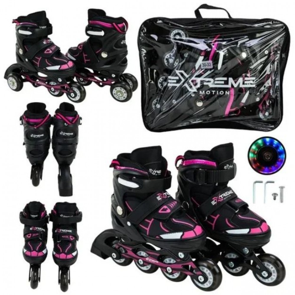 Роликові ковзани розміру S (30–33) створені для комфортного катання та активного відпочинку. Оснащені поліуретановими колесами, що забезпечують плавний і стійкий рух, а світловий ефект додає яскравості під час прогулянок. Завдяки регульованій конструкції ковзани підлаштовуються під розмір ноги, що дозволяє використовувати їх довше. Надійна система фіксації забезпечує стабільність і комфорт, а сумка допоможе зручно переносити ролики.