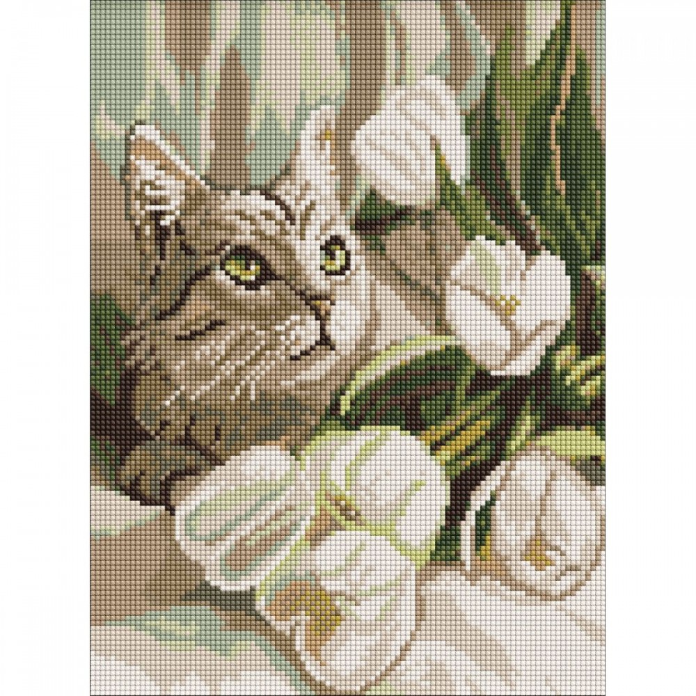 Интернет-магазин eToys предлагает вашему вниманию товар "Алмазная мозаика "Зеленоглазый кот с тюльпанами" 30х40 см" по цене 463 грн..