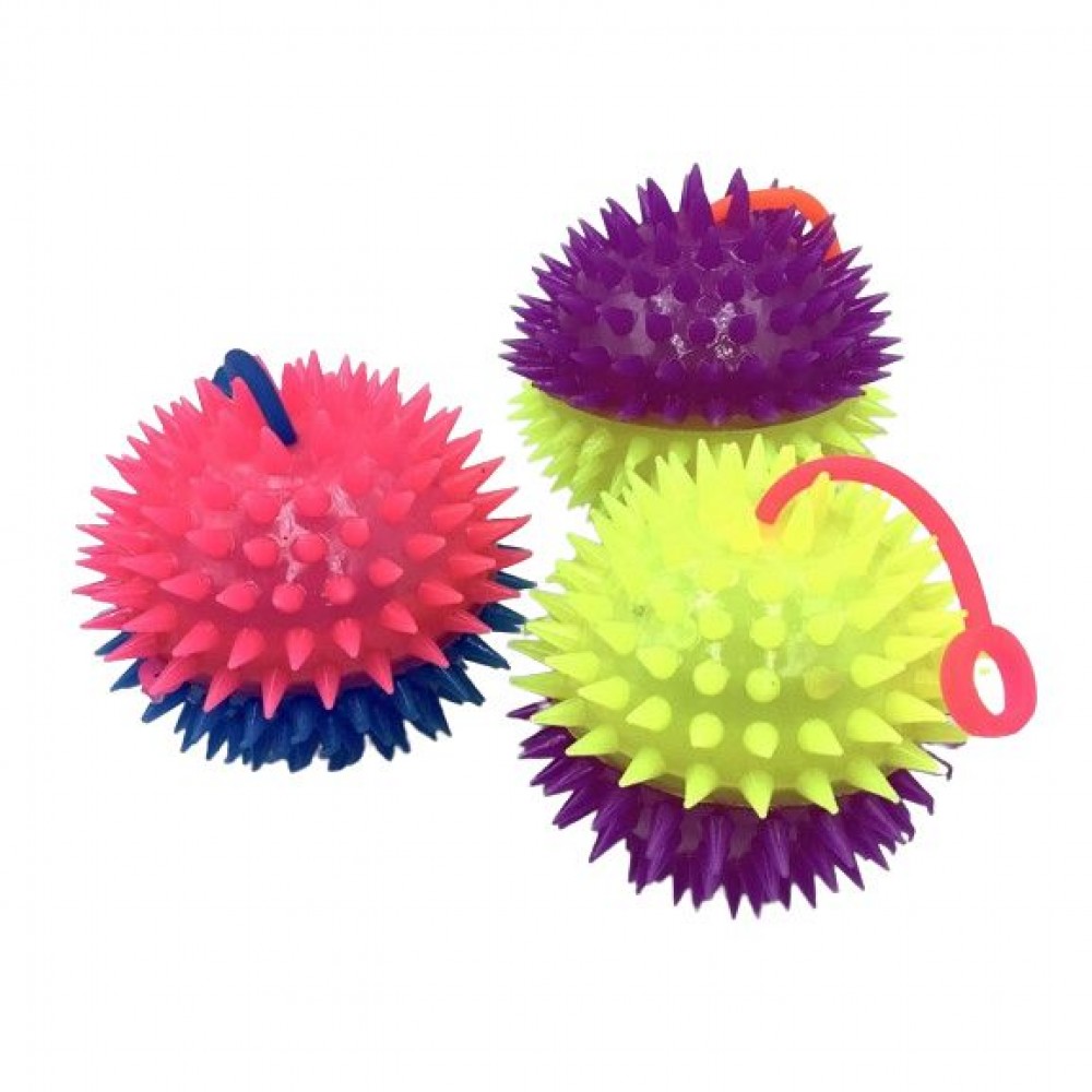 Детский резиновый мячик-пищалка с шипами и "хвостиком", оснащённый колечком для пальца, идеально подходит для игры в стиле йо-йо. Изготовлен из безопасного и прочного материала, он легко сжимается и издаёт забавный пищащий звук при нажатии. Со светом. Разные цвета в ассортименте. Диаметр - 6 см.