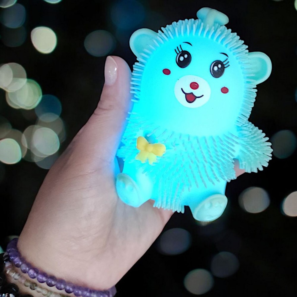 Смешная светяшка в виде мохнатого мишки. Резиновый мишка пуст внутри и наполнен воздухом по типу надувного шара. Внутри игрушки также пластиковая светяшка, которая активируется при ударе о поверхность. Размер игрушки – 9х8х5 см. Выполнено из качественных и безопасных материалов. Для детей старше 3-х лет. Если игрушка немного сдута, можно накачать ее с помощью обычного медицинского шприца с иглой (на игрушке есть специальное отверстие).