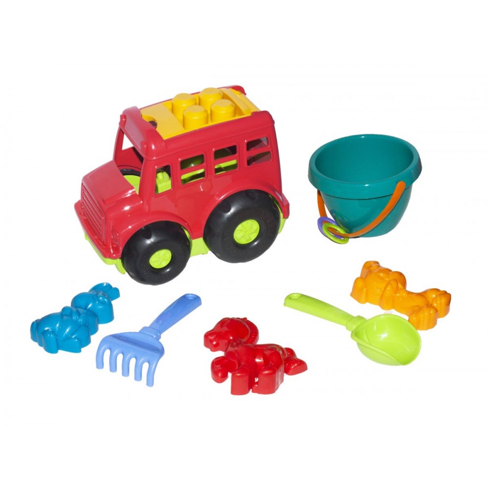 Машинка автобус "Бусик" №3 с песочным набором. Песочный набор состоит из: (ведёрко, лопатка, грабельки, 3 пасочки). _