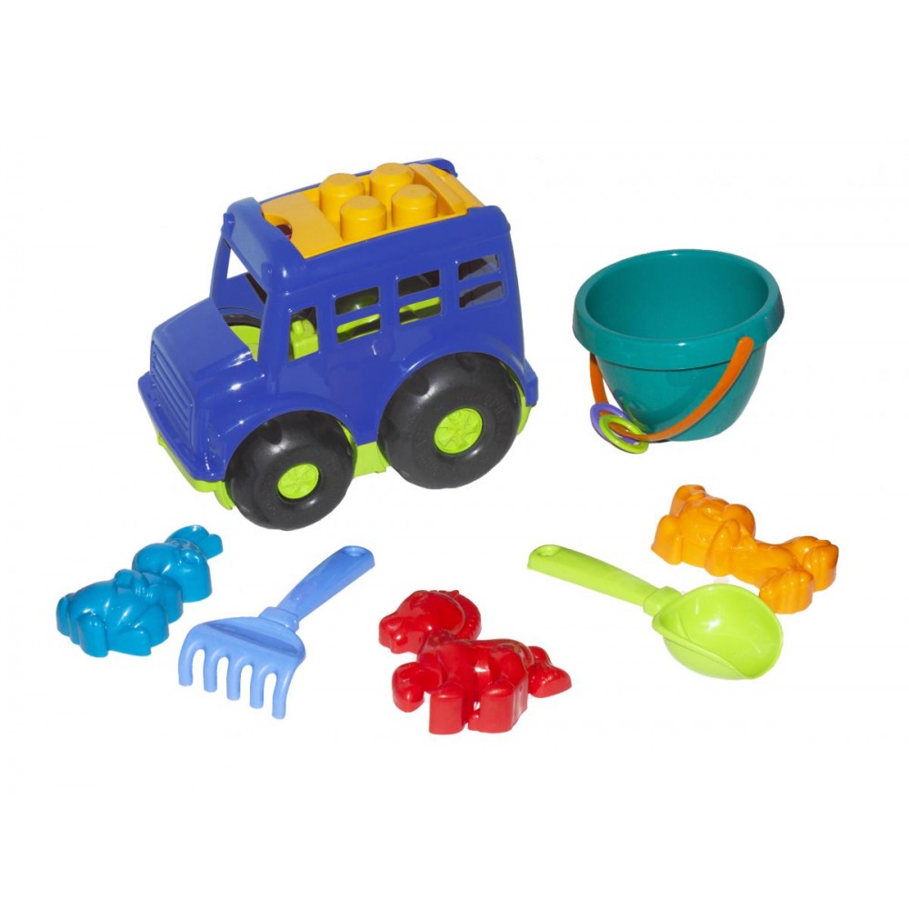 Машинка автобус "Бусик" №3 с песочным набором. Песочный набор состоит из: (ведёрко, лопатка, грабельки, 3 пасочки). _