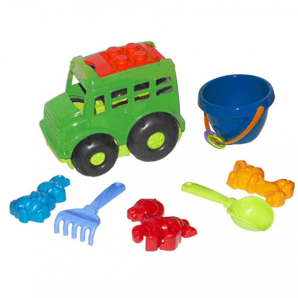 Машинка автобус "Бусик" №3 с песочным набором. Песочный набор состоит из: (ведёрко, лопатка, грабельки, 3 пасочки). _