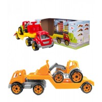 Пластиковый оранжевый автокран. Имеет поворачивающуюся площадку с выдвижной стрелой, которая может подниматься.