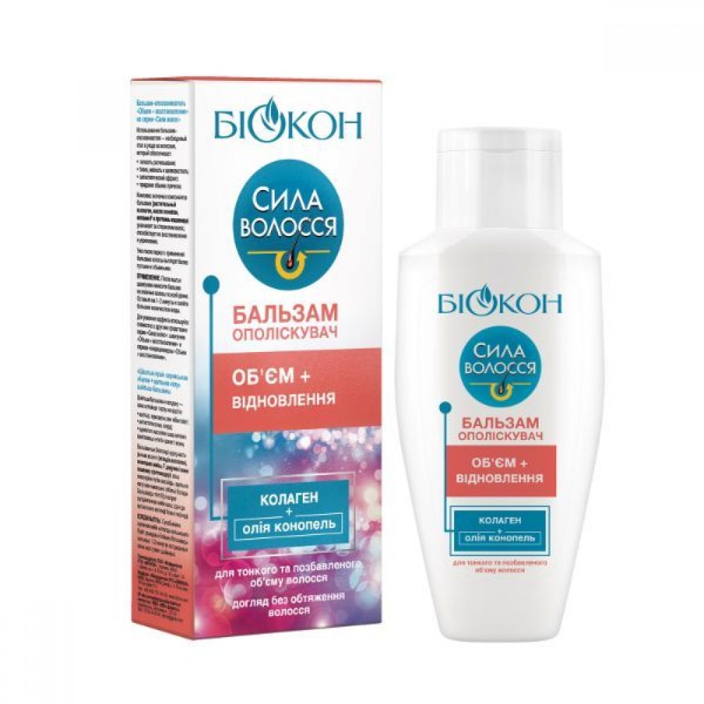 Бальзам-ополаскиватель для волос Биокон Сила волос Объем+восстановление Коллаген+Масло конопли. Он питает волосы коллагеном и маслом конопли, делает его гладкими, мягкими и блестящими, облегчает расчесывание, предотвращает электризацию и придает объем. После первого применения вы увидите эффект от использования. Основные преимущества бальзама-ополаскивателя для волос Биокон Сила волос Объем+восстановление Коллаген+Масло конопли: питает и укрепляет волосы, облегчает расчесывание, придает волосам блеск, мягкость и шелковистость, обладает антистатическим эффектом, придает волосам объем. Действующий компонент: коллаген, масло конопли.