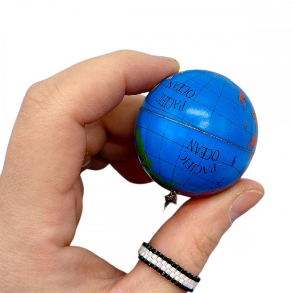 Брелок выполнен в виде миниатюрного глобуса с изображением материков и океанов. Благодаря металлическому креплению его удобно использовать для ключей, портфеля или школьного рюкзака.