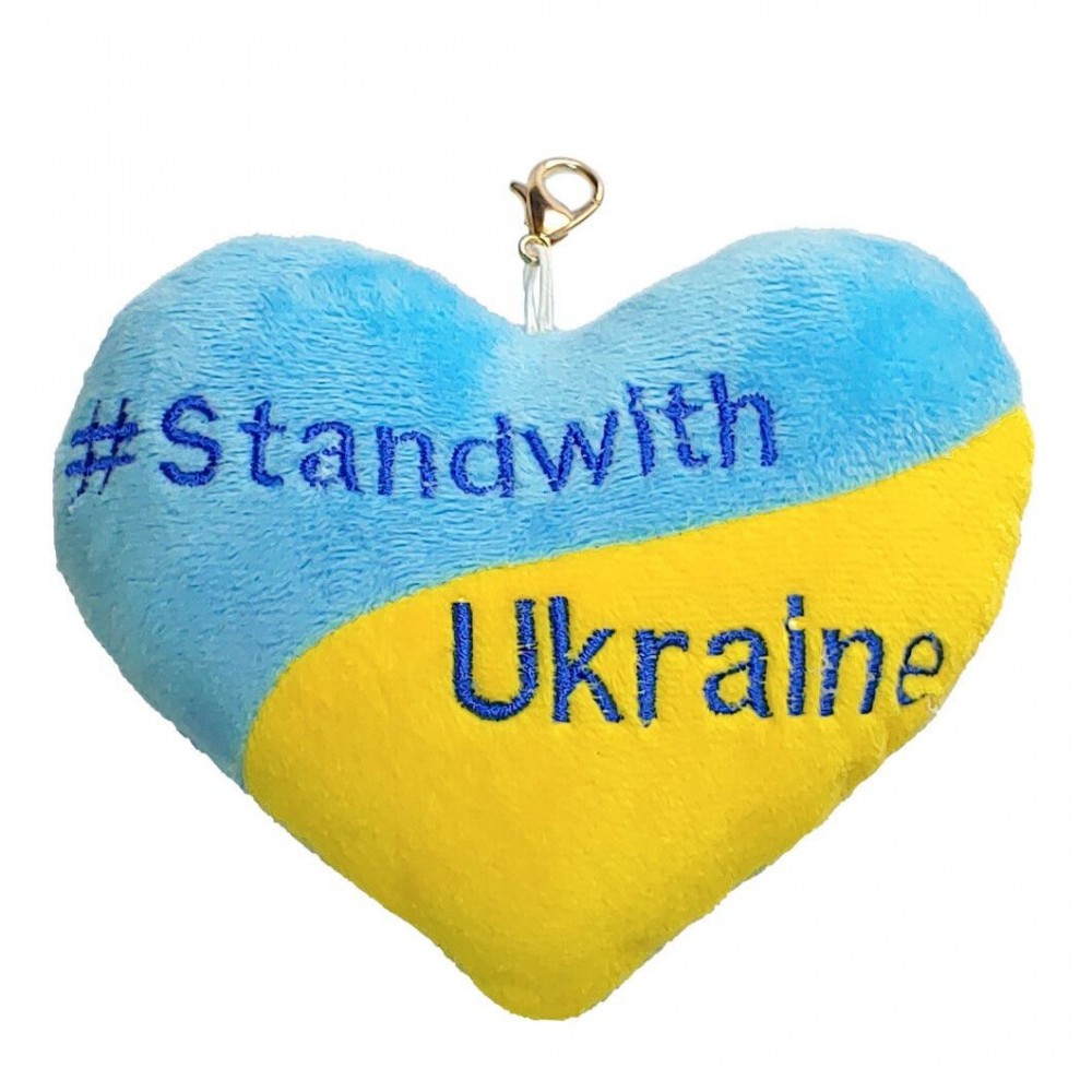 Мягкий брелок в форме сердца. Выполнен в цветах флага Украины с патриотической надписью "Stand with Ukraine". У брелока небольшой карабин за который его легко можно прикрепить к ключам или рюкзаку. Размер 13х10х4 см.